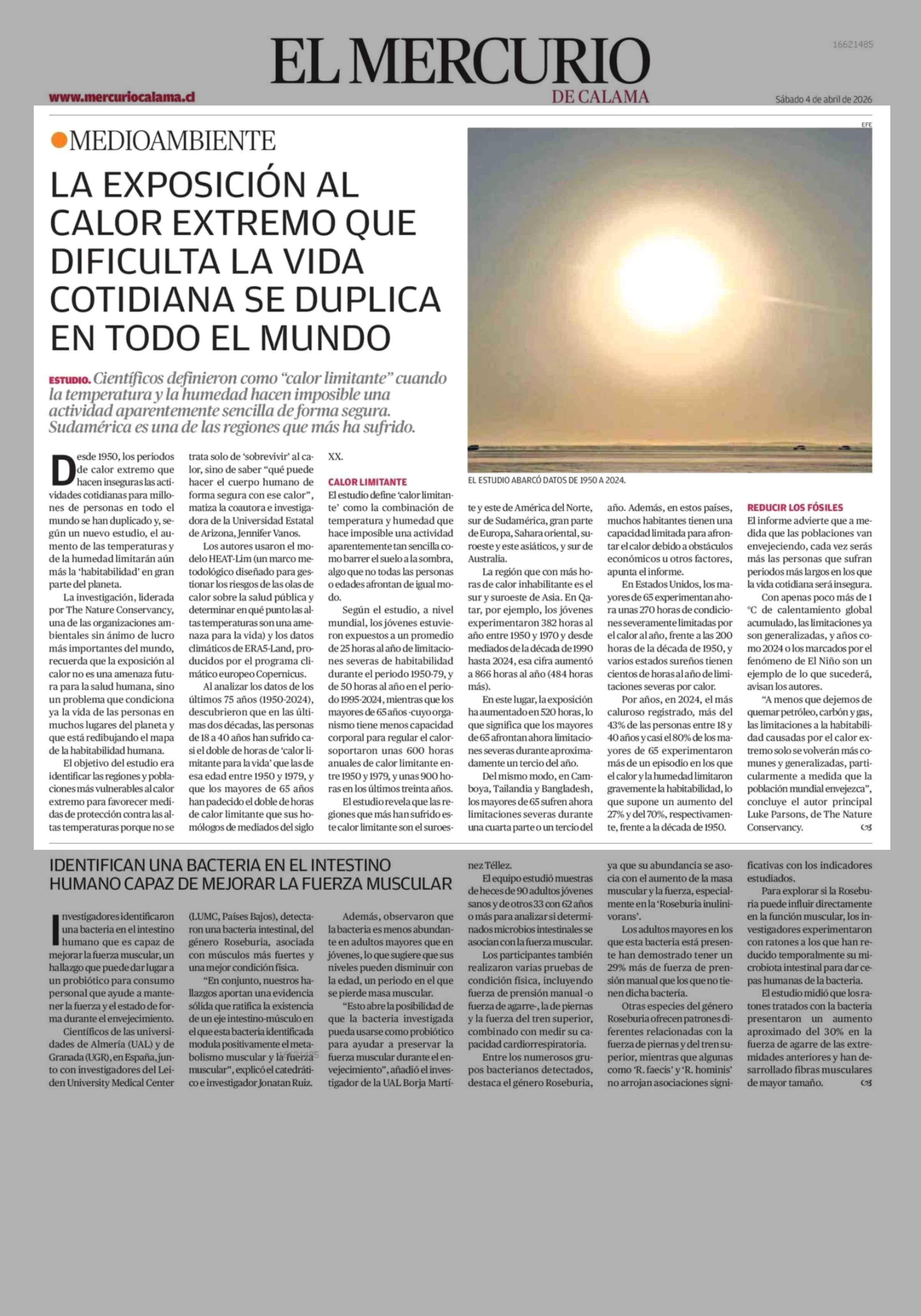 LA EXPOSICIÓN AL CALOR EXTREMO QUE DIFICULTA LA VIDA COTIDIANA SE DUPLICA EN TODO EL MUNDO 04-04-2026 El Mercurio de Calama |