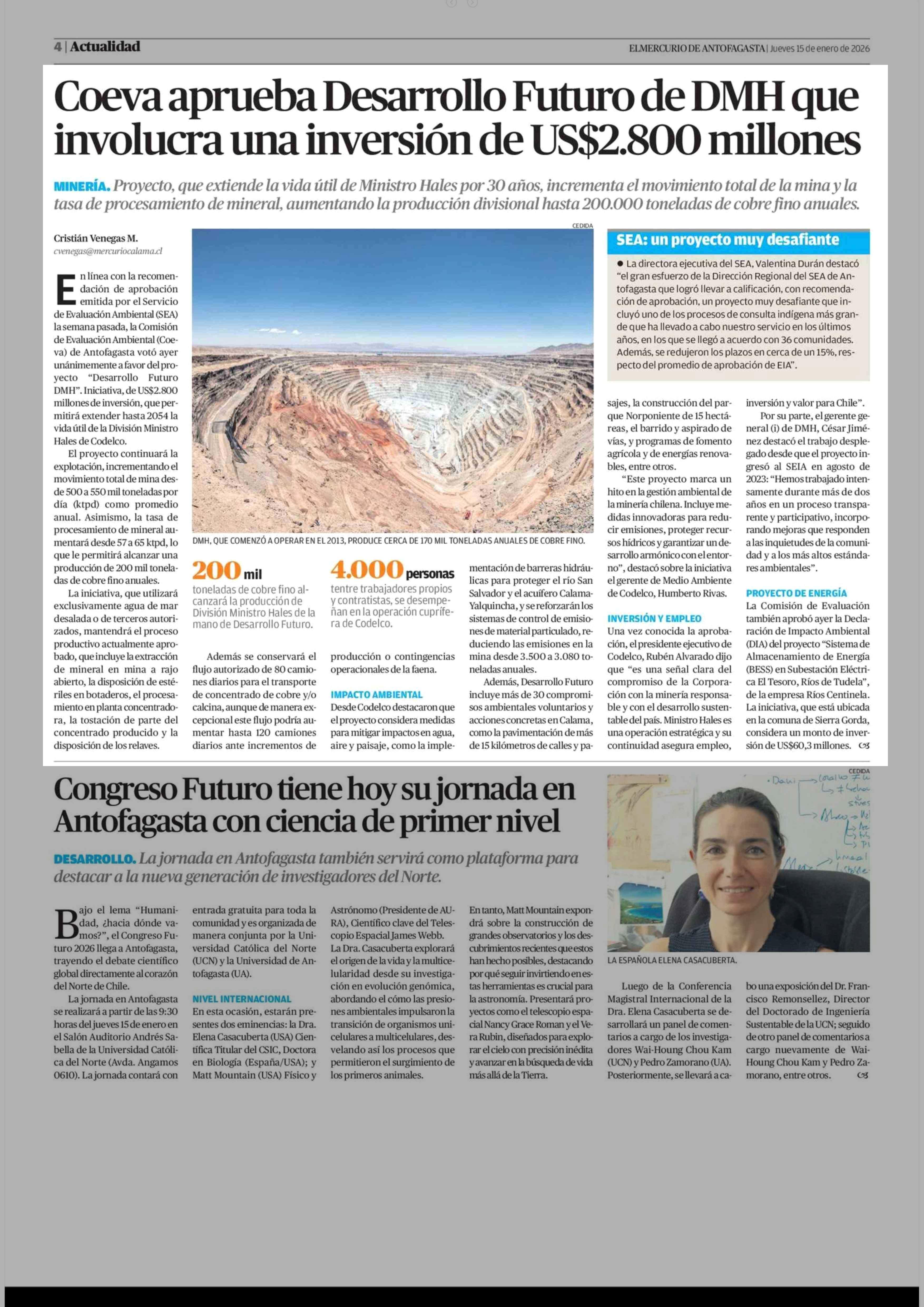 Coeva aprueba Desarrollo Futuro de DMH que involucra una inversión de US$2.800 millones 15-01-2026 El Mercurio de Antofagasta |