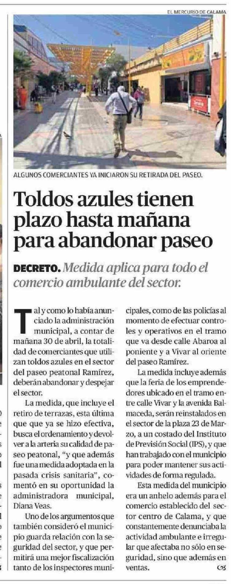 Toldos azules tienen plazo hasta mañana para abandonar paseo 29-04-2025 El Mercurio de Calama |