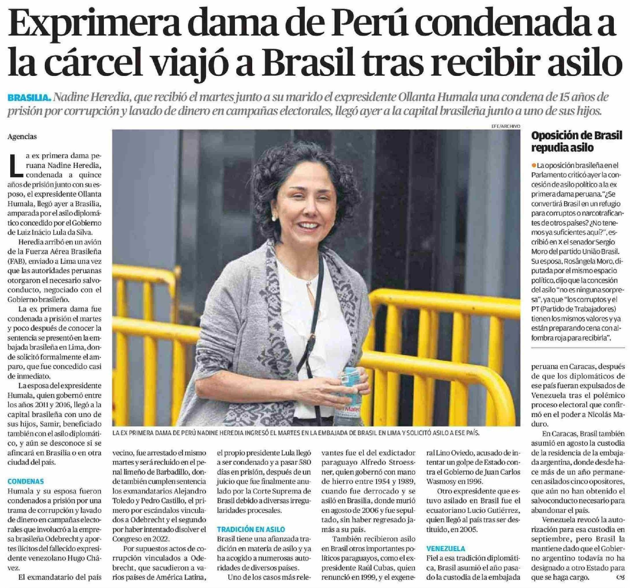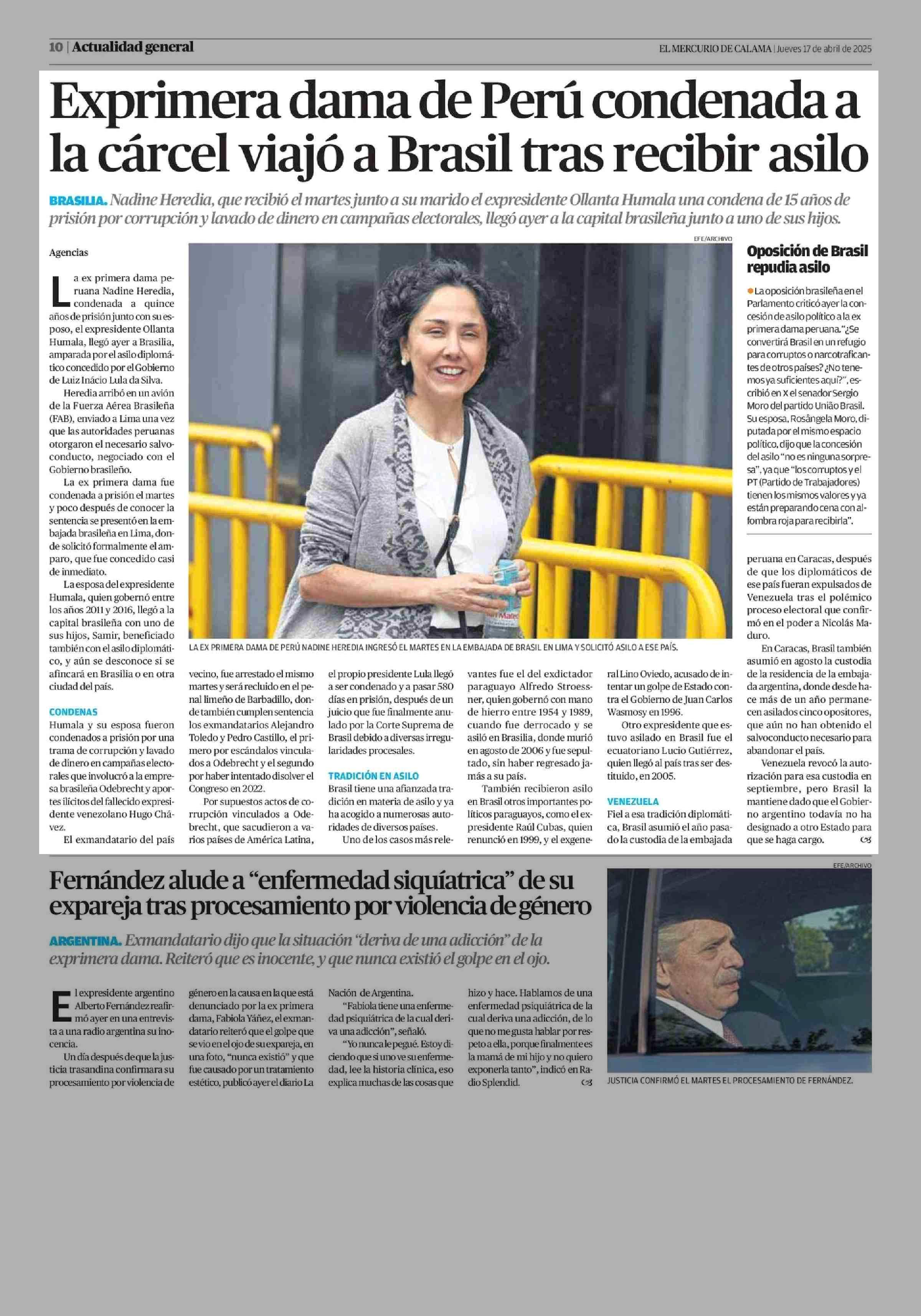 Exprimera dama de Perú condenada a la cárcel viajó a Brasil tras recibir asilo 17-04-2025 El Mercurio de Calama |
