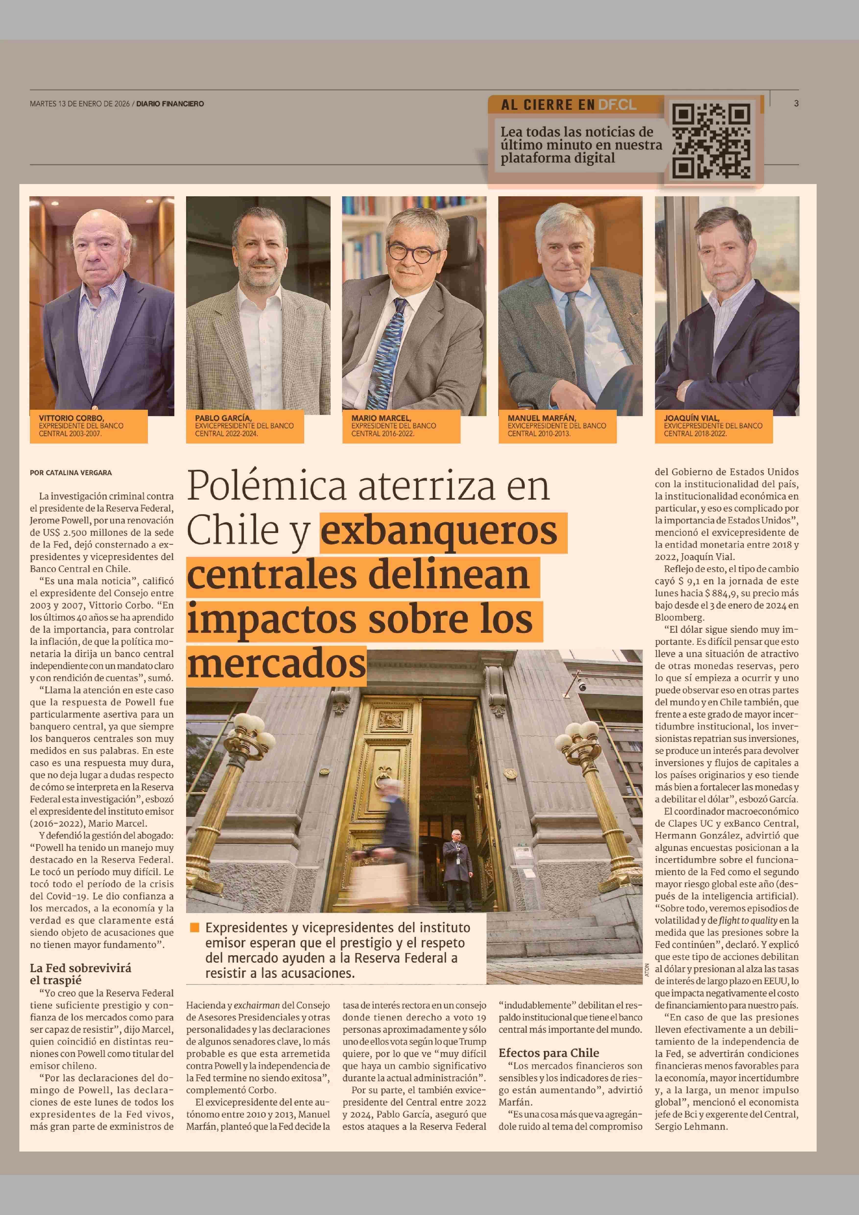 Polémica aterriza en Chile y exbanqueros centrales delinean impactos sobre los mercados 13-01-2026 Diario Financiero |