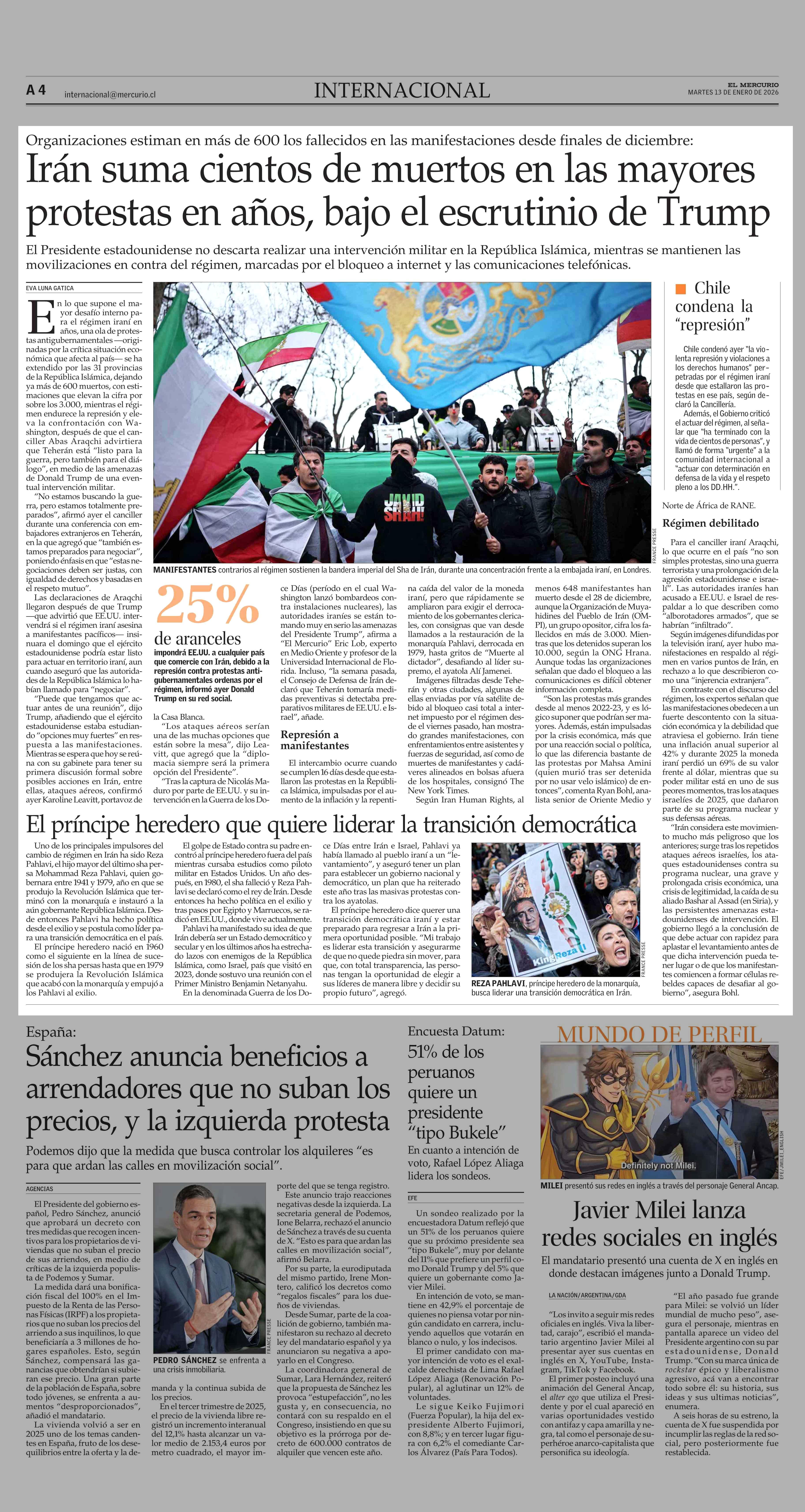Irán suma cientos de muertos en las mayores protestas en años, bajo el escrutinio de Trump 13-01-2026 El Mercurio |