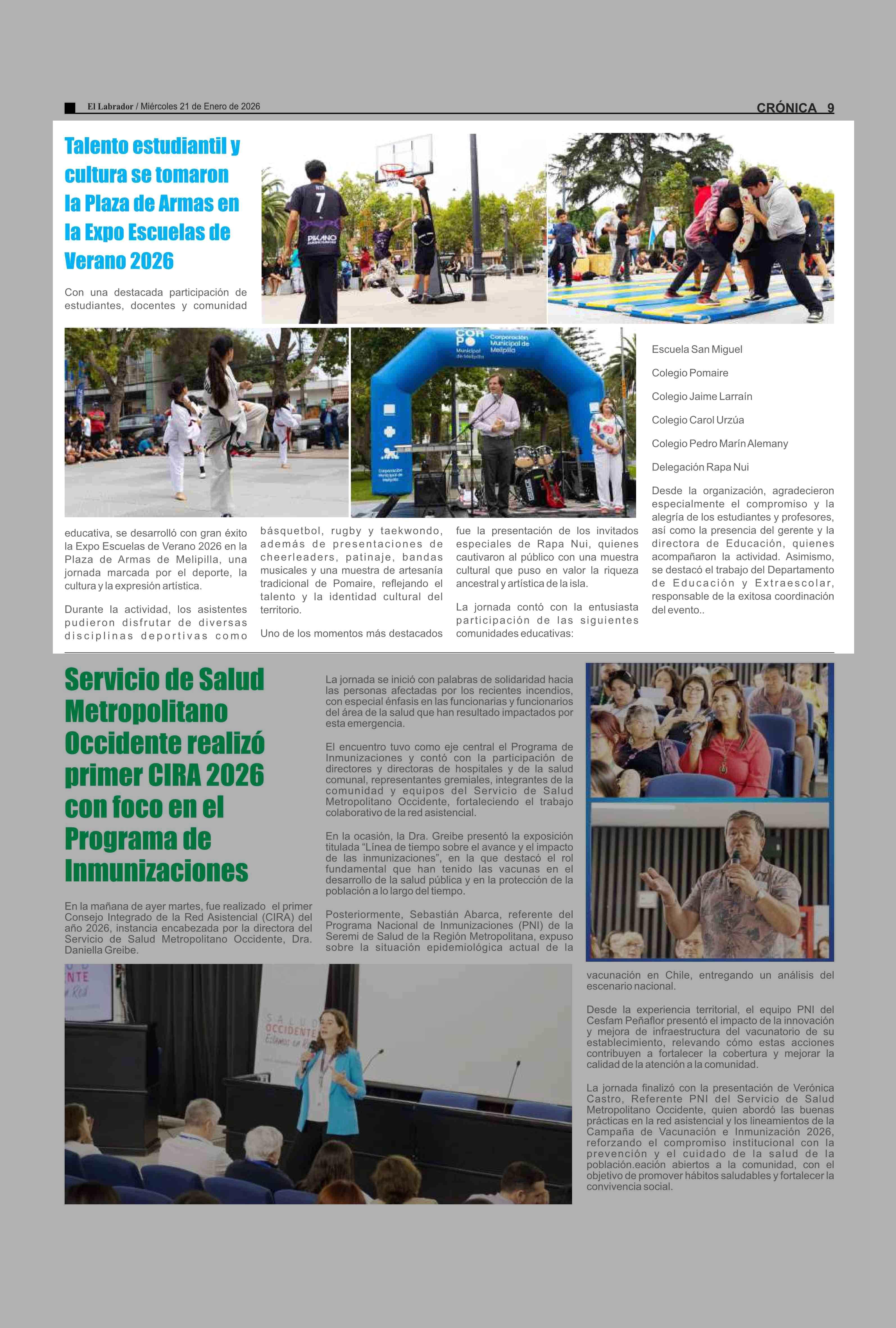| Título: | educativa, se desarrolló con gran éxito la Expo Escuelas de Verano 2026 en la Plaza de Armas de Melipilla, una jornada marcada por el deporte, la cultura y la expresión artística. Durante la actividad, los asistentes pudieron disfrutar de diversas disciplinas deportivas como |
