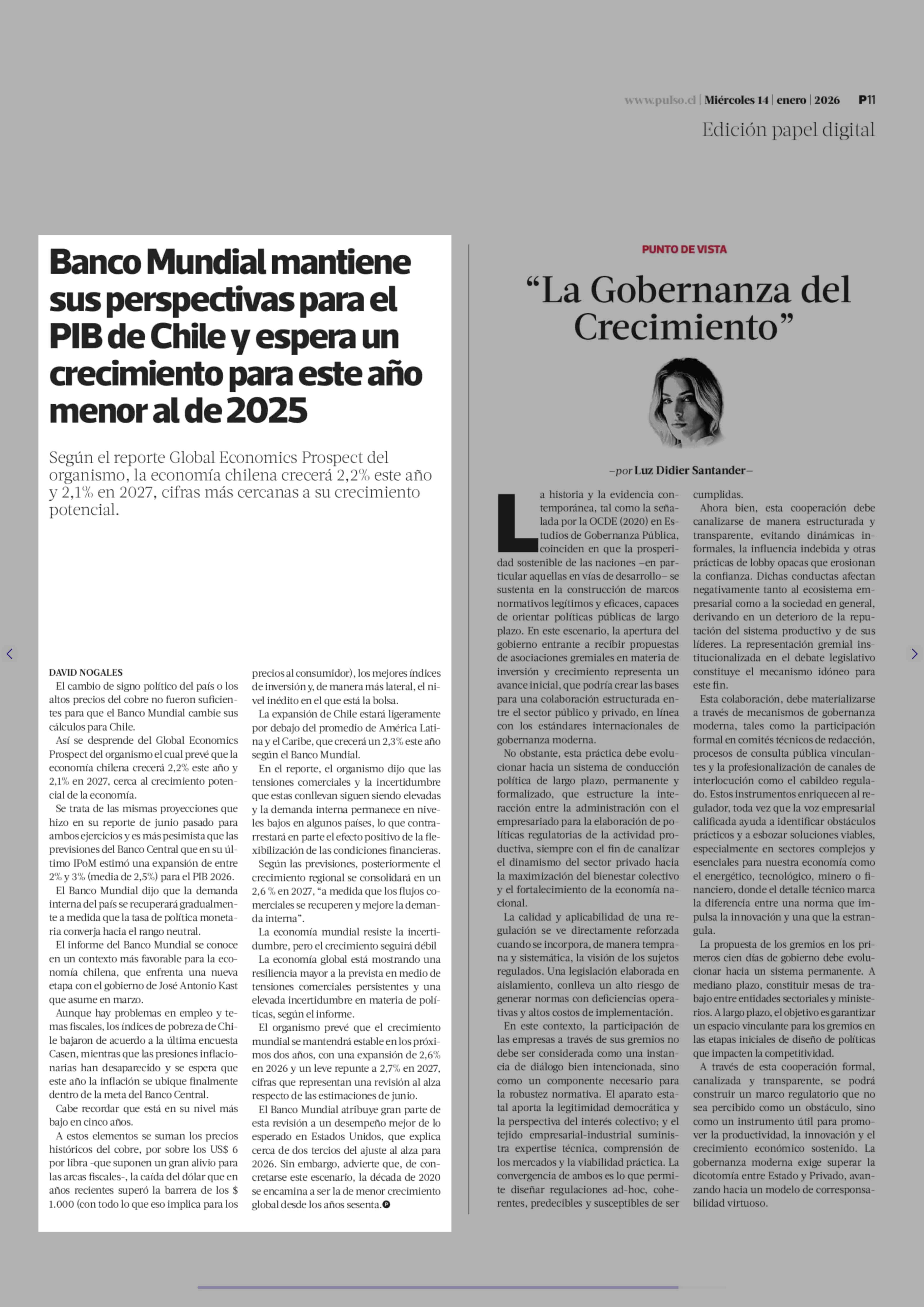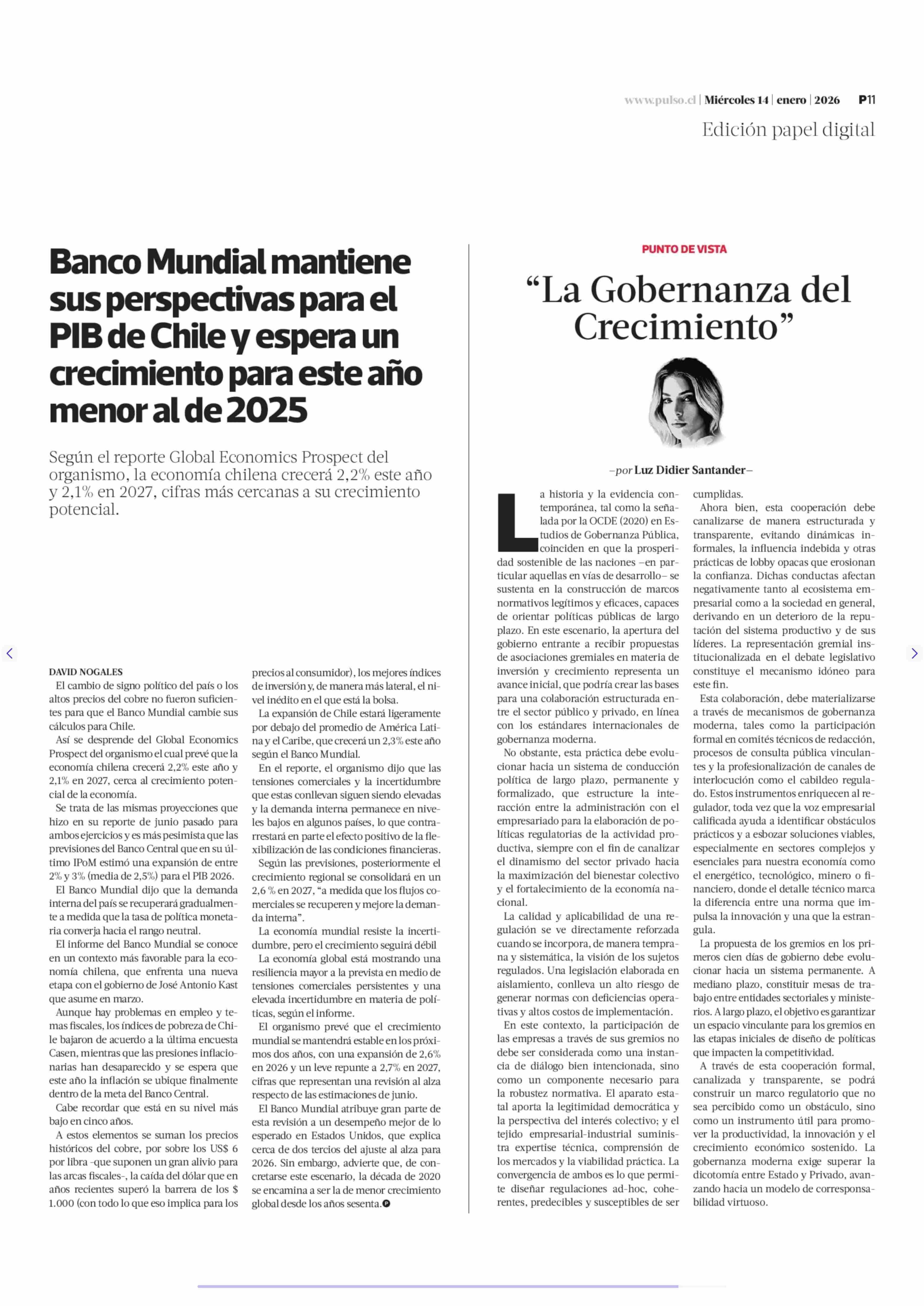 Banco Mundial mantiene sus perspectivas para el PIB de Chile y espera un crecimiento para este año menor al de 2025 14-01-2026 La Tercera |