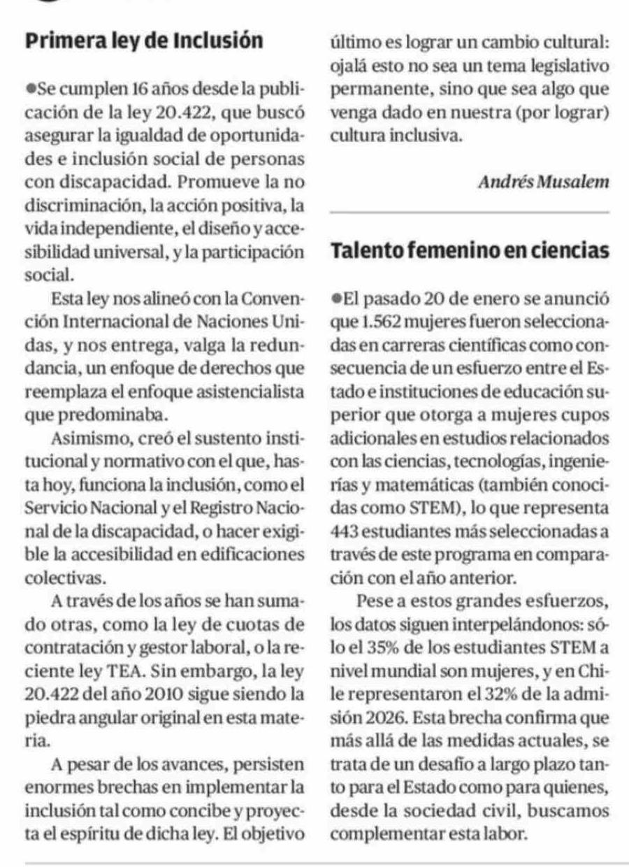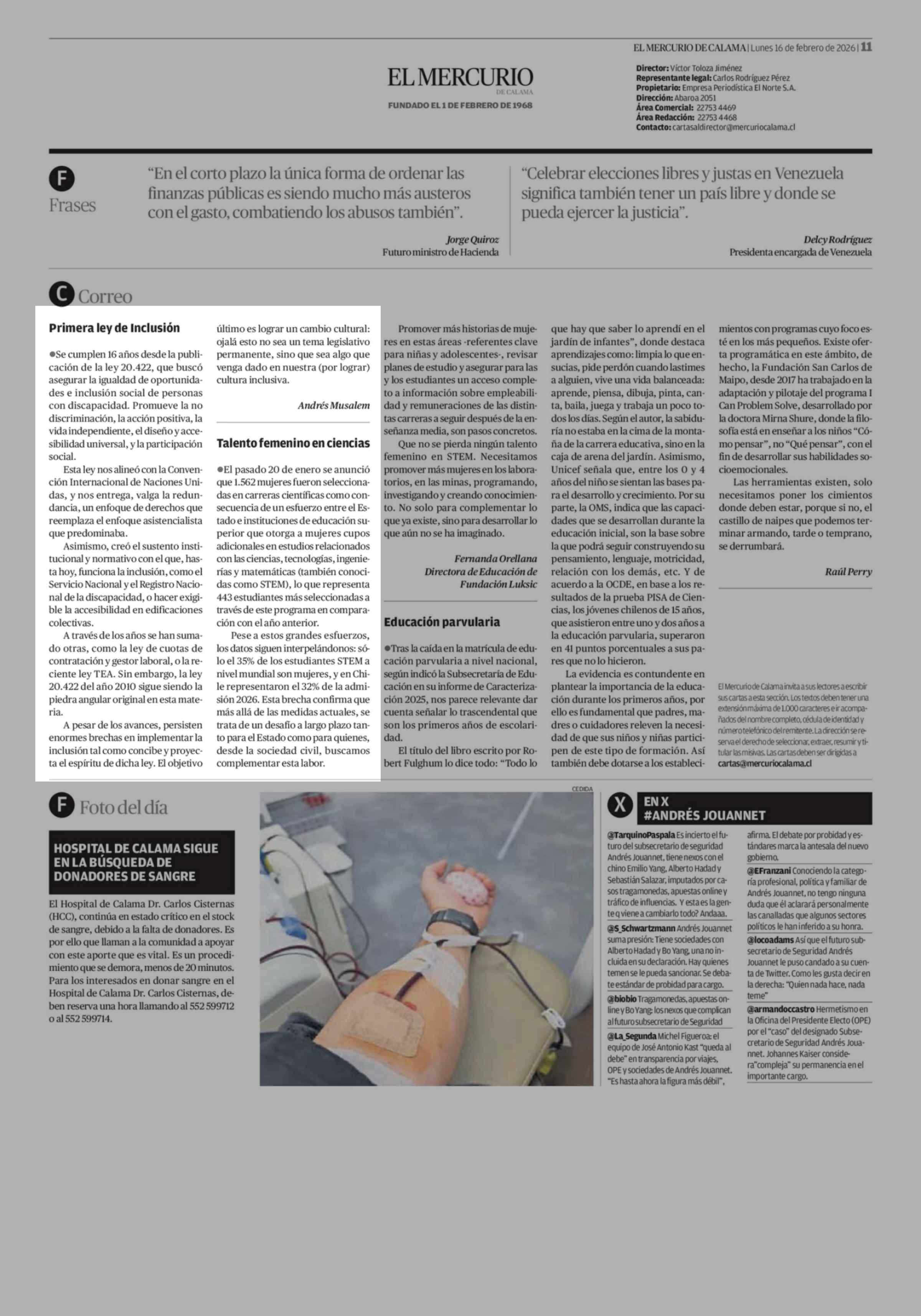 Cartas: Primera ley de Inclusión 16-02-2026 El Mercurio de Calama |