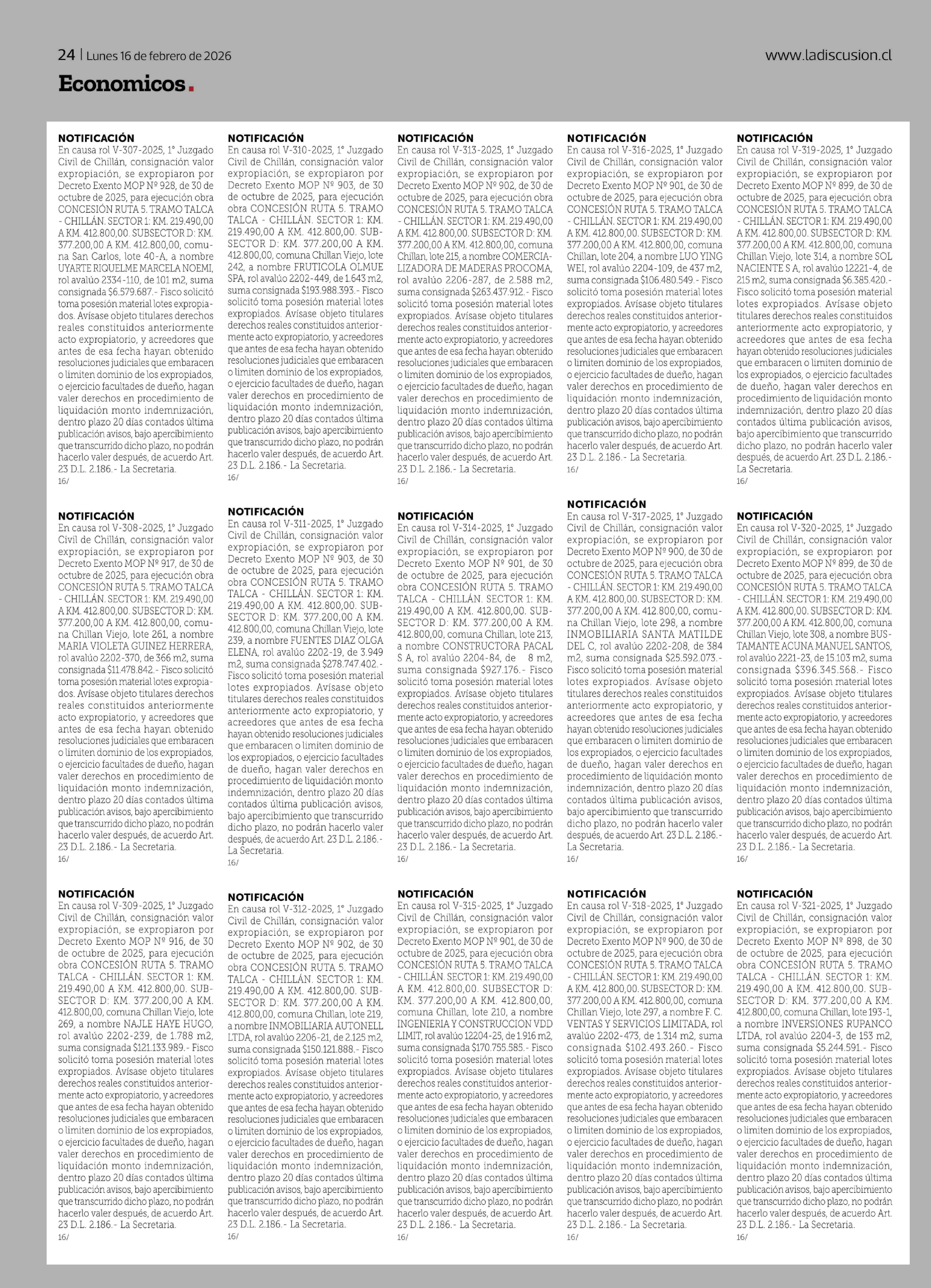 NOTIFICACIÓN En causa rol V-308-2025, 1° Juzgado Civil de Chillán, consignación valor expropiación, se expropiaron por Decreto Exento MOP Nº 917, de 30 de octubre de 2025, para ejecución obra CONCESIÓN RUTA 5. TRAMO TALCA - CHILLÁN. SECTOR 1: KM. 219.490,00 AKM. 412.800,00. SUBSECTOR D: KM. 377.200,