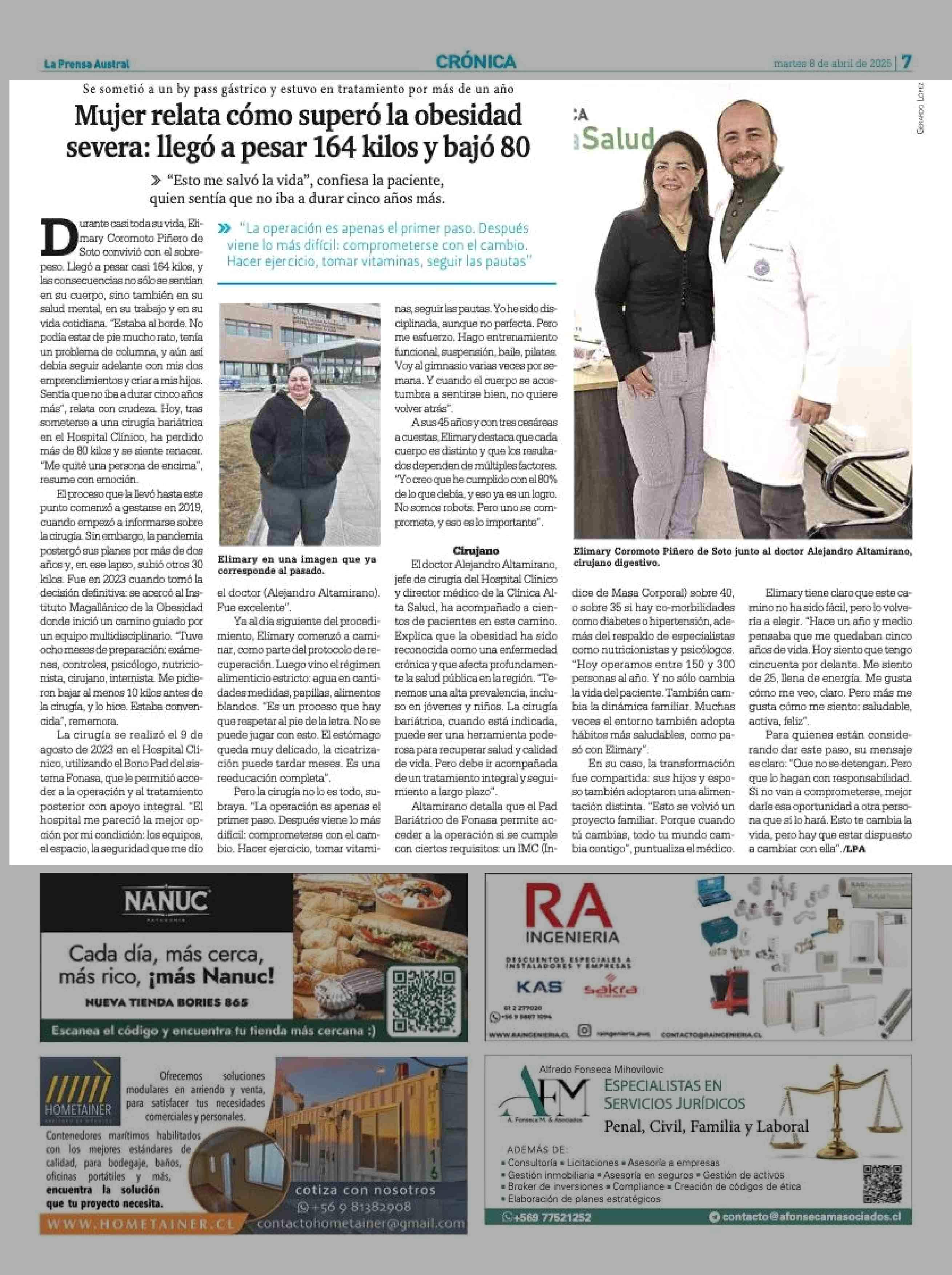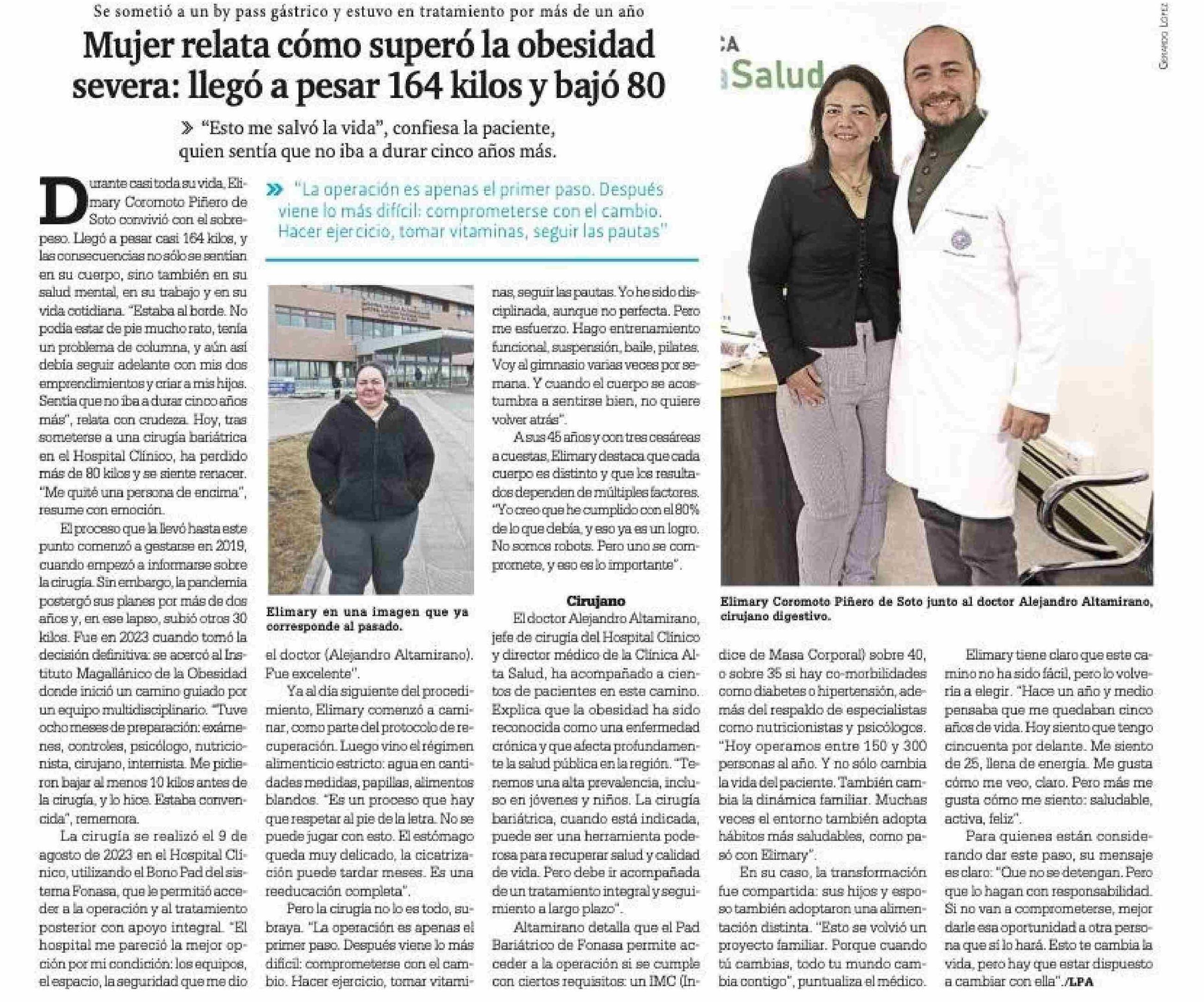 Mujer relata cómo superó la obesidad severa: llegó a pesar 164 kilos y bajó 80 08-04-2025 La Prensa Austral |