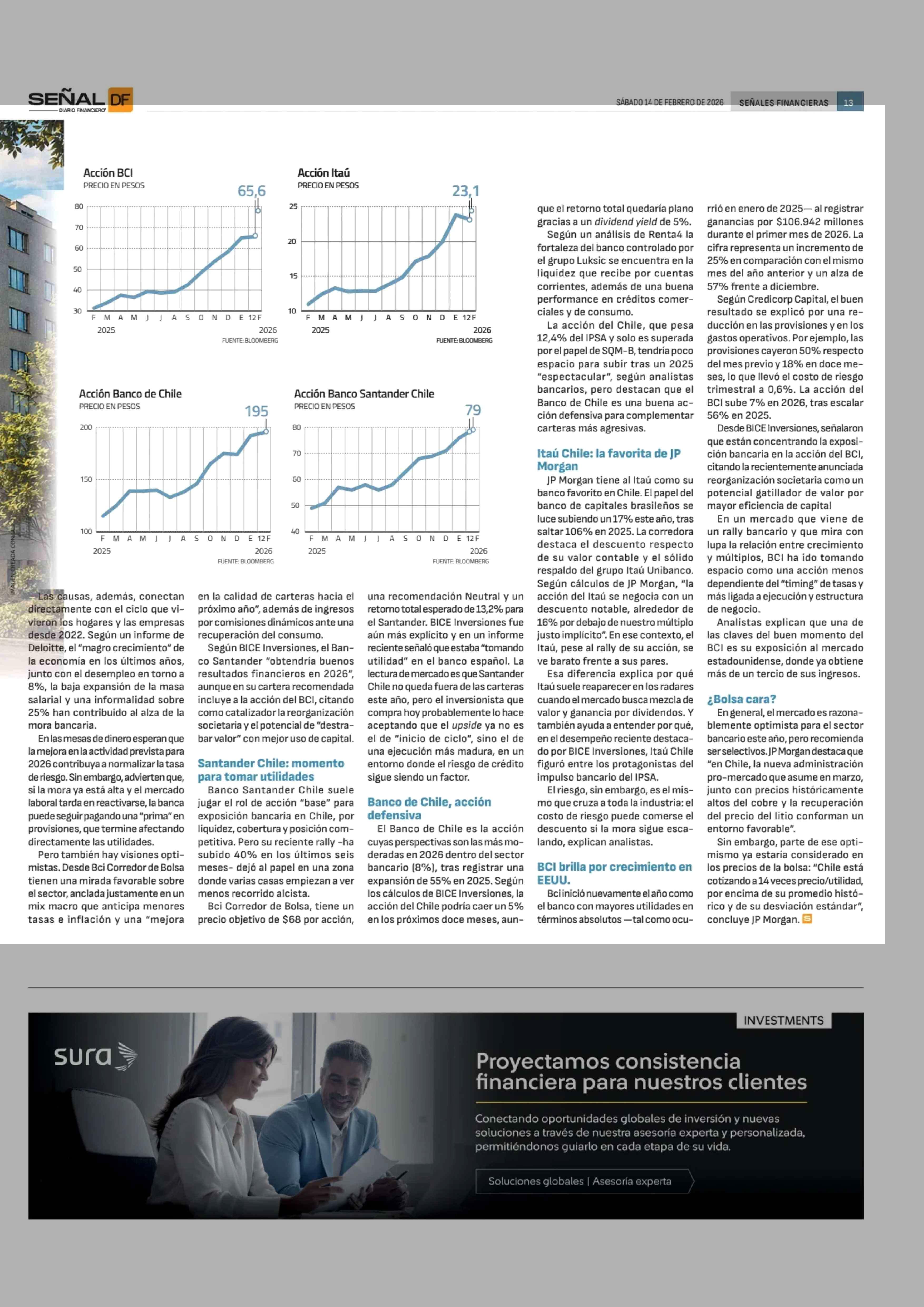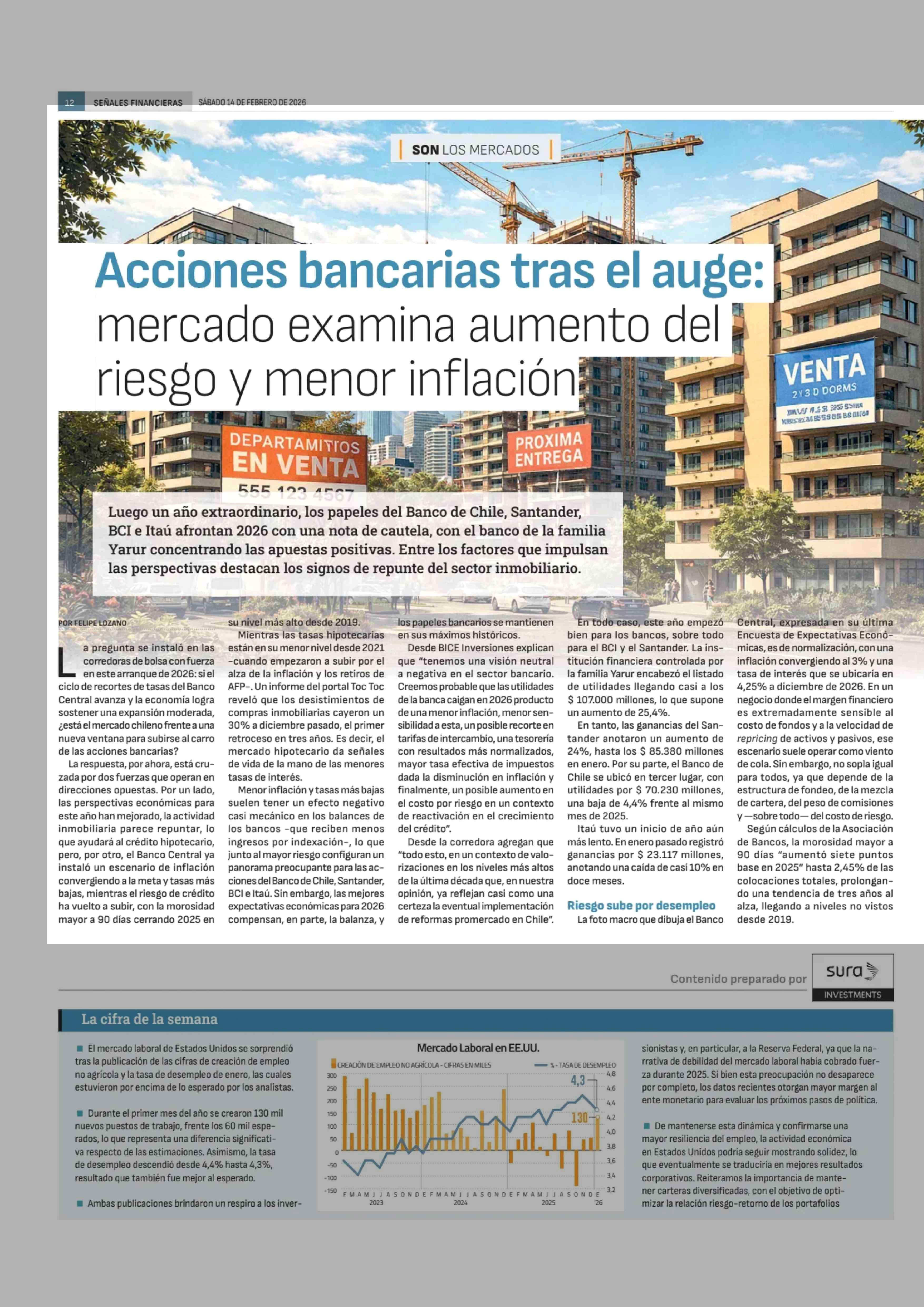 Acciones bancarias tras el auge: mercado examina aumento del riesgo y menor inflación 14-02-2026 Diario Financiero |