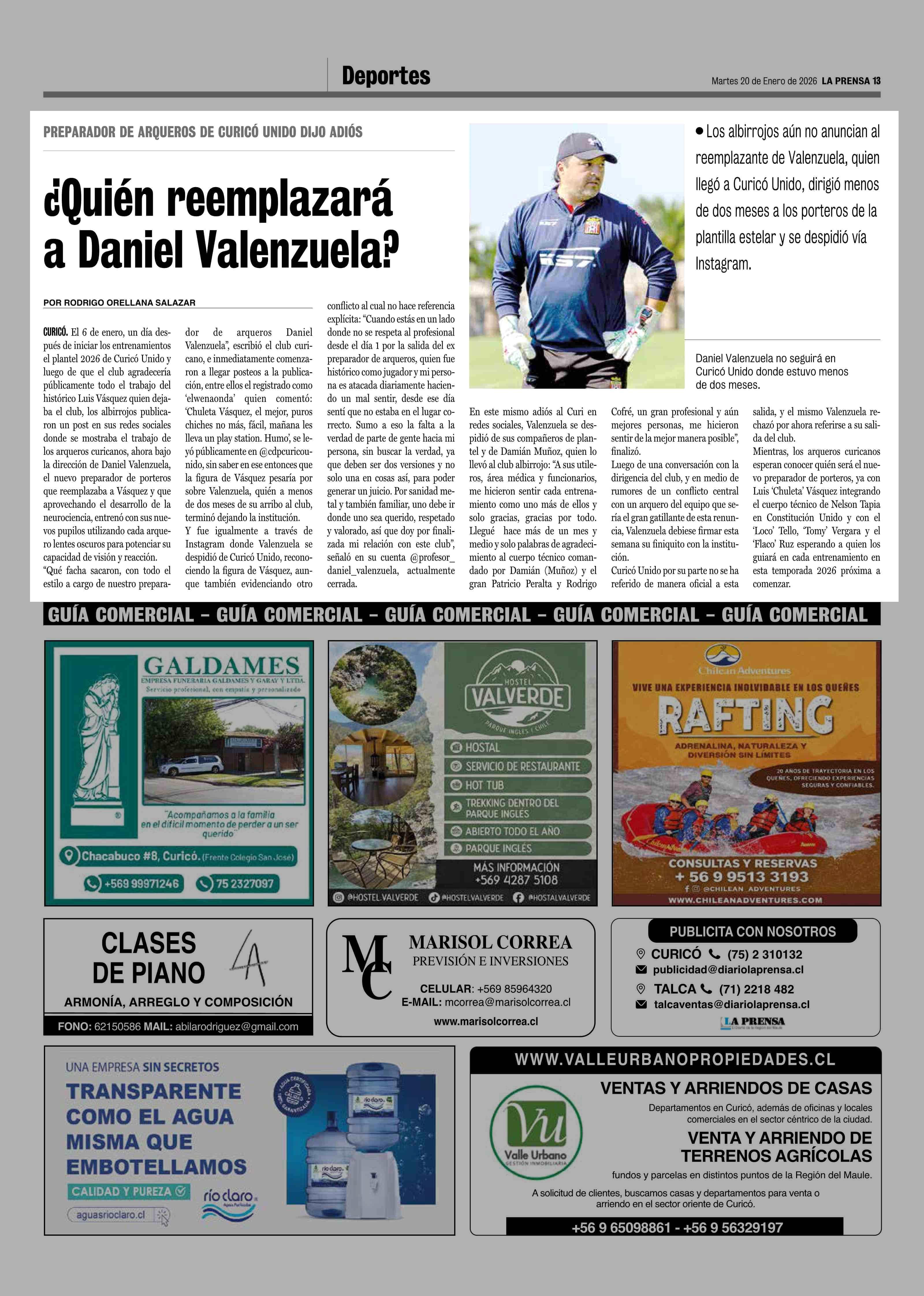 ¿Quién reemplazará a Daniel Valenzuela? 20-01-2026 La Prensa de Curicó |