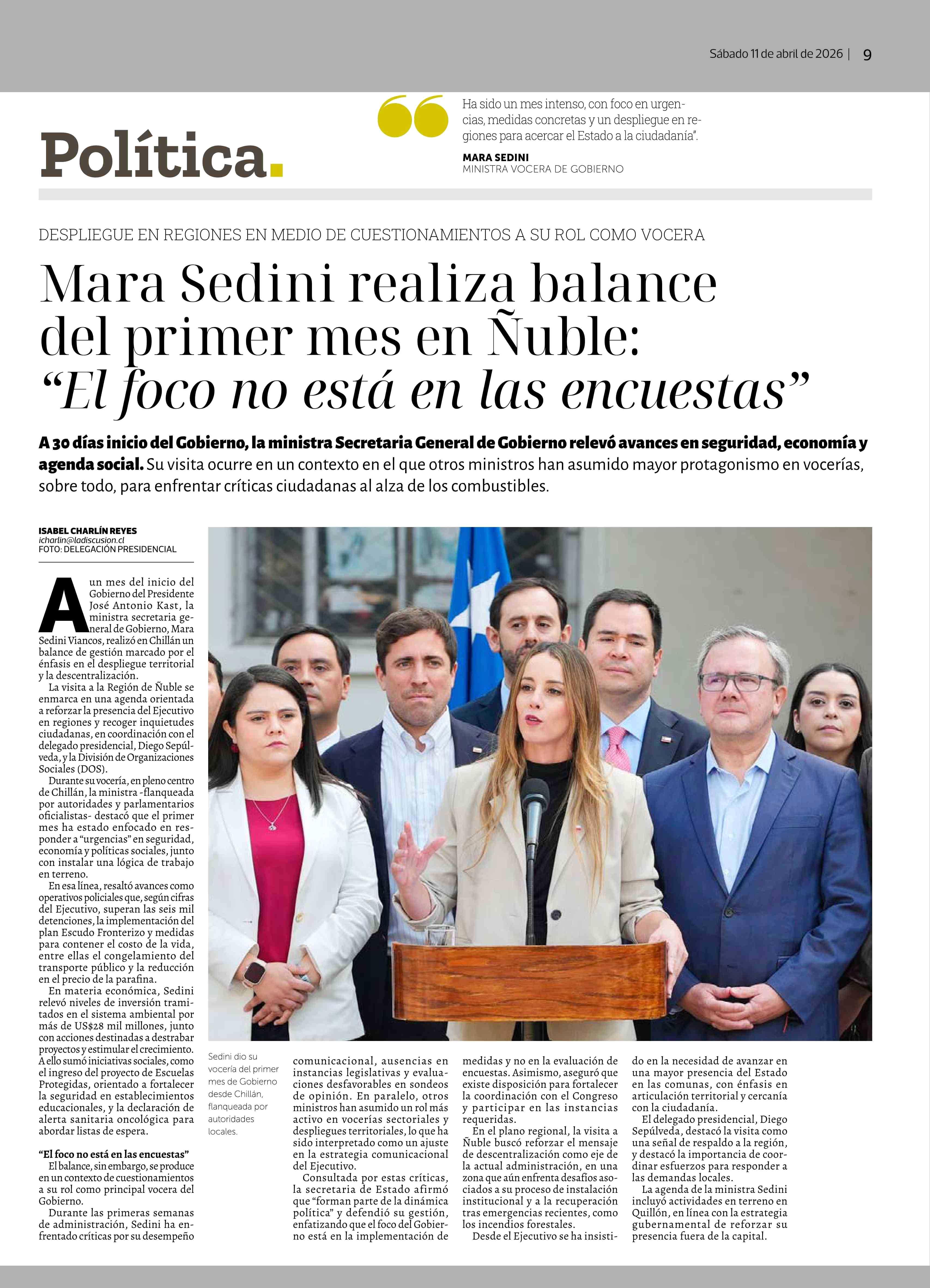 Mara Sedini realiza balance del primer mes en Xuble: “El foco no está en las encuestas” 11-04-2026 La Discusión |