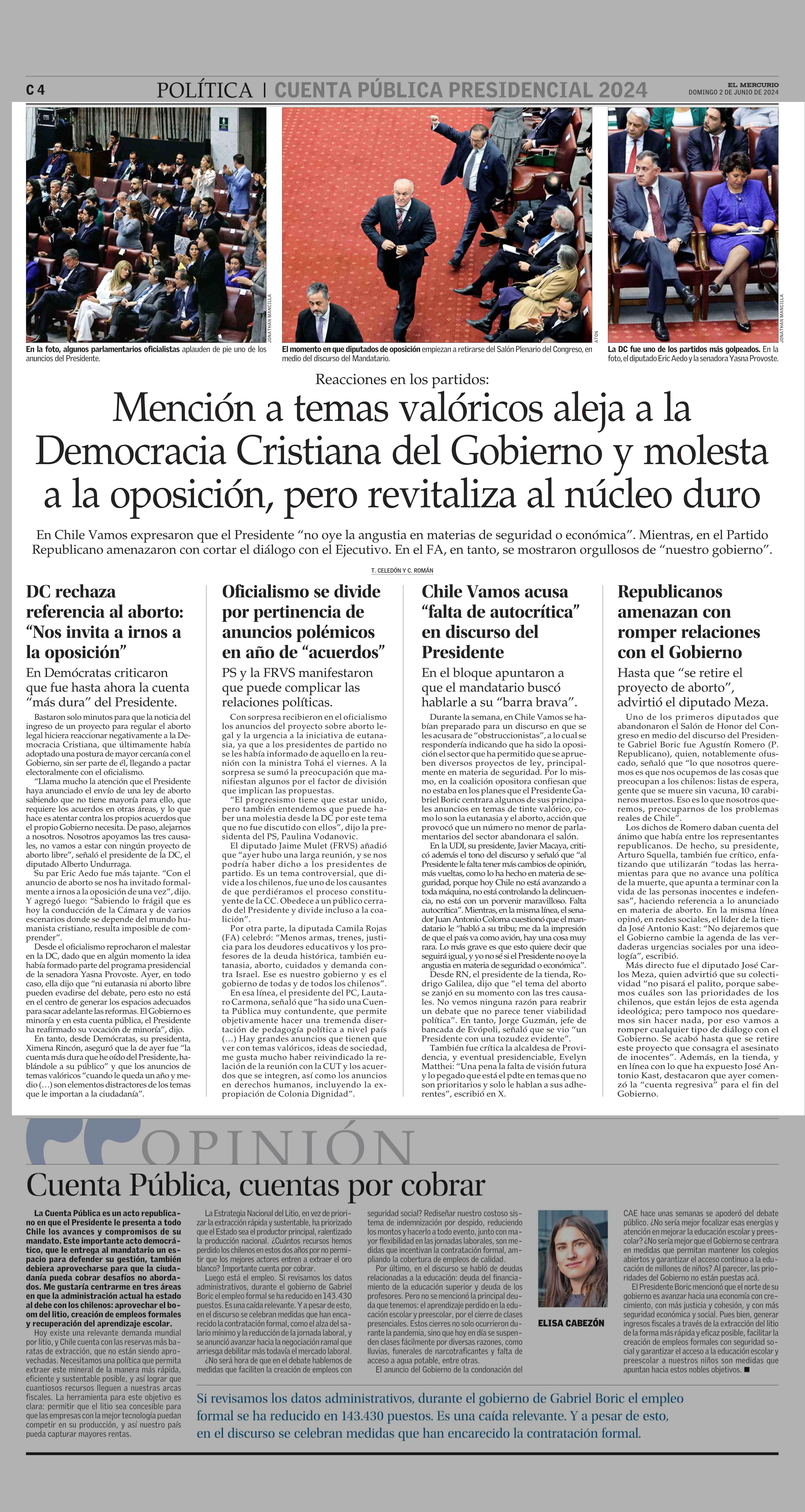 Mención a temas valóricos aleja a la Democracia Cristiana del Gobierno y molesta a la oposición, pero revitaliza al núcleo duro 02-06-2024 El Mercurio |
