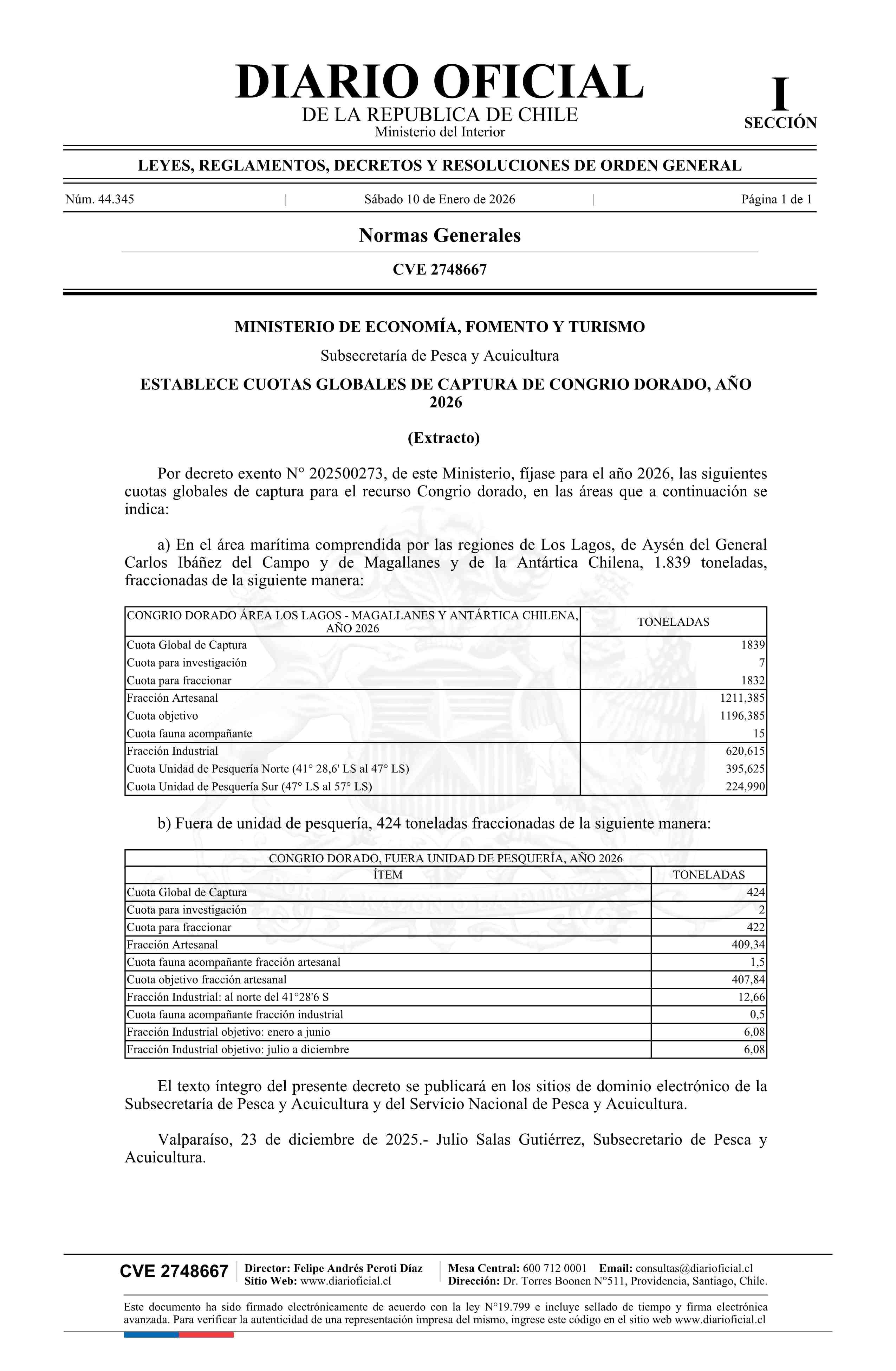 Extracto de decreto exento número 202500273, de 2025.- Establece cuotas globales de captura de Congrio dorado, año 2026 10-01-2026 Diario Oficial Edición Electrónica |