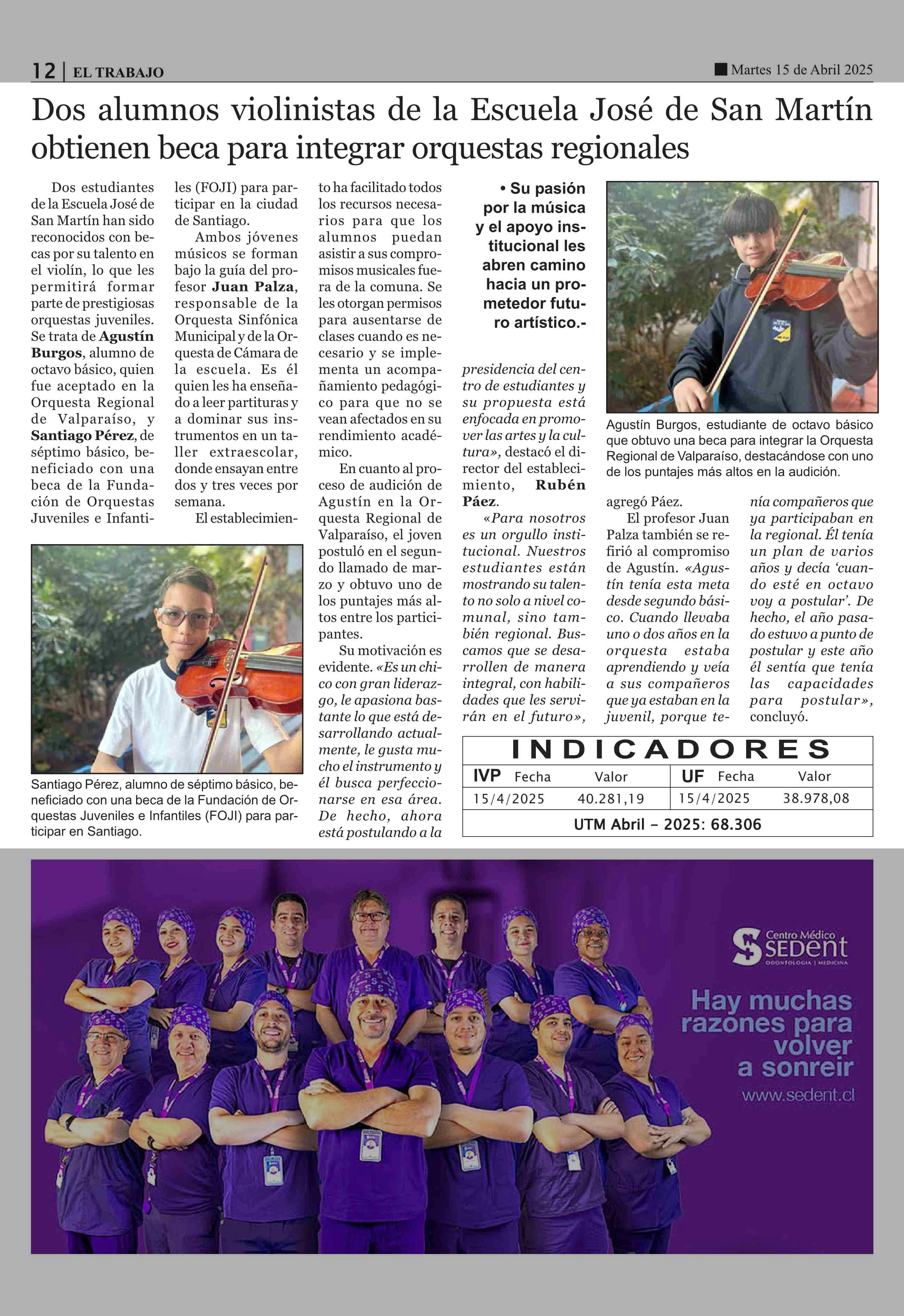 Dos alumnos violinistas de la Escuela José de San Martín obtienen beca para integrar orquestas regionales 15-04-2025 El Trabajo |