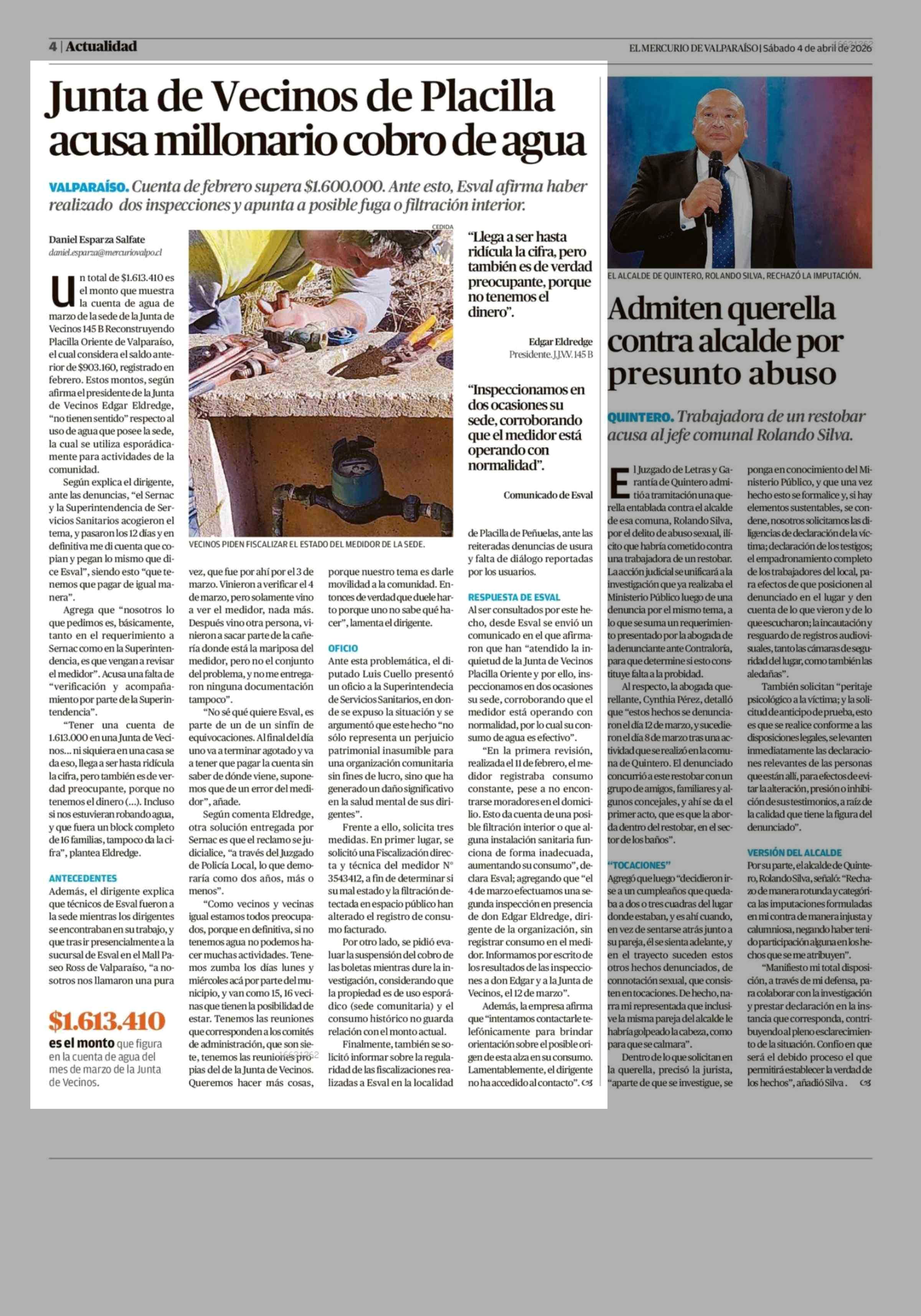 Junta de Vecinos de Placilla acusa millonario cobro de agua 04-04-2026 El Mercurio de Valparaíso |