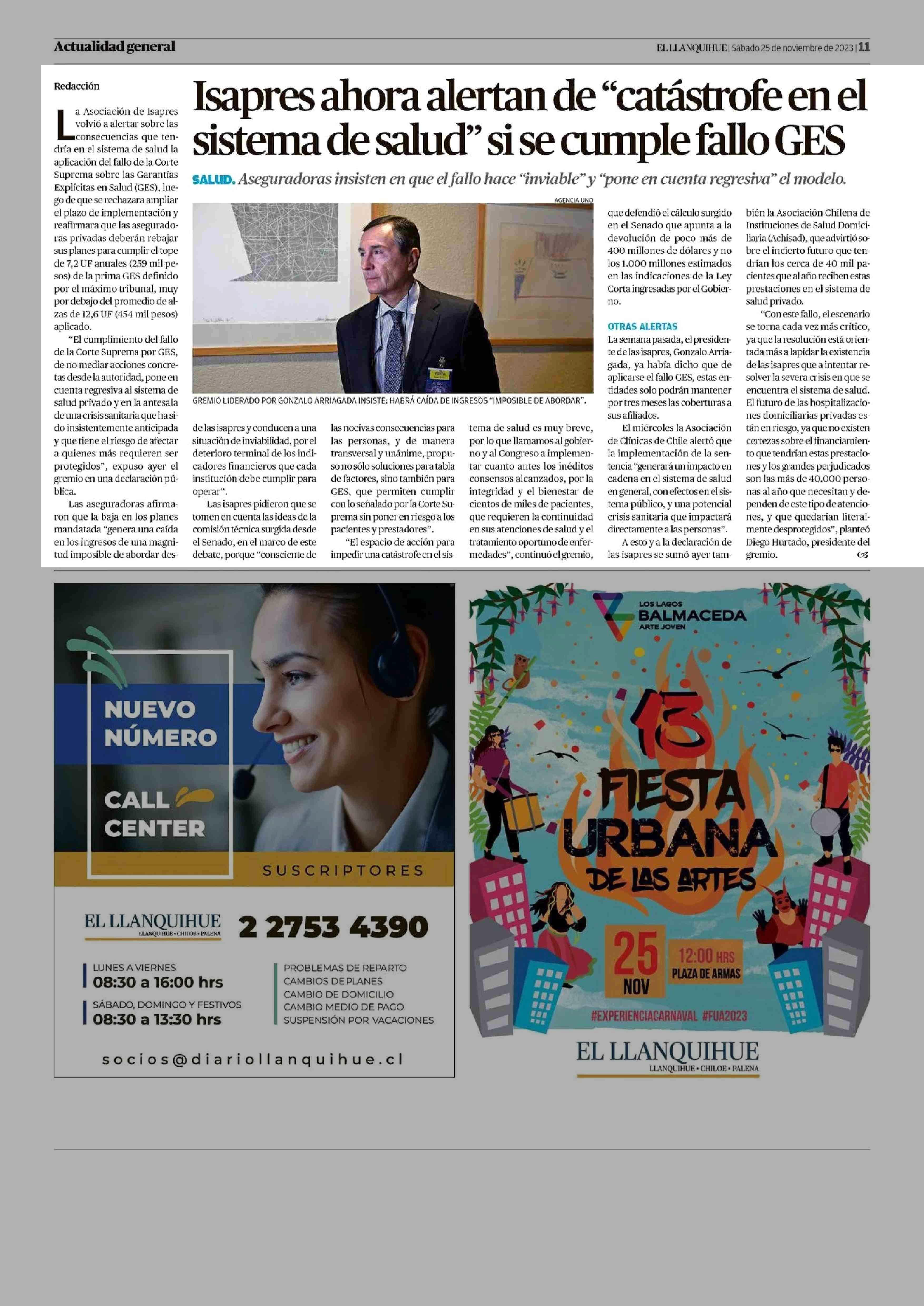 Isapres ahora alertan de “catástrofe en el sistema de salud” si se cumple fallo GES 25-11-2023 El Llanquihue |
