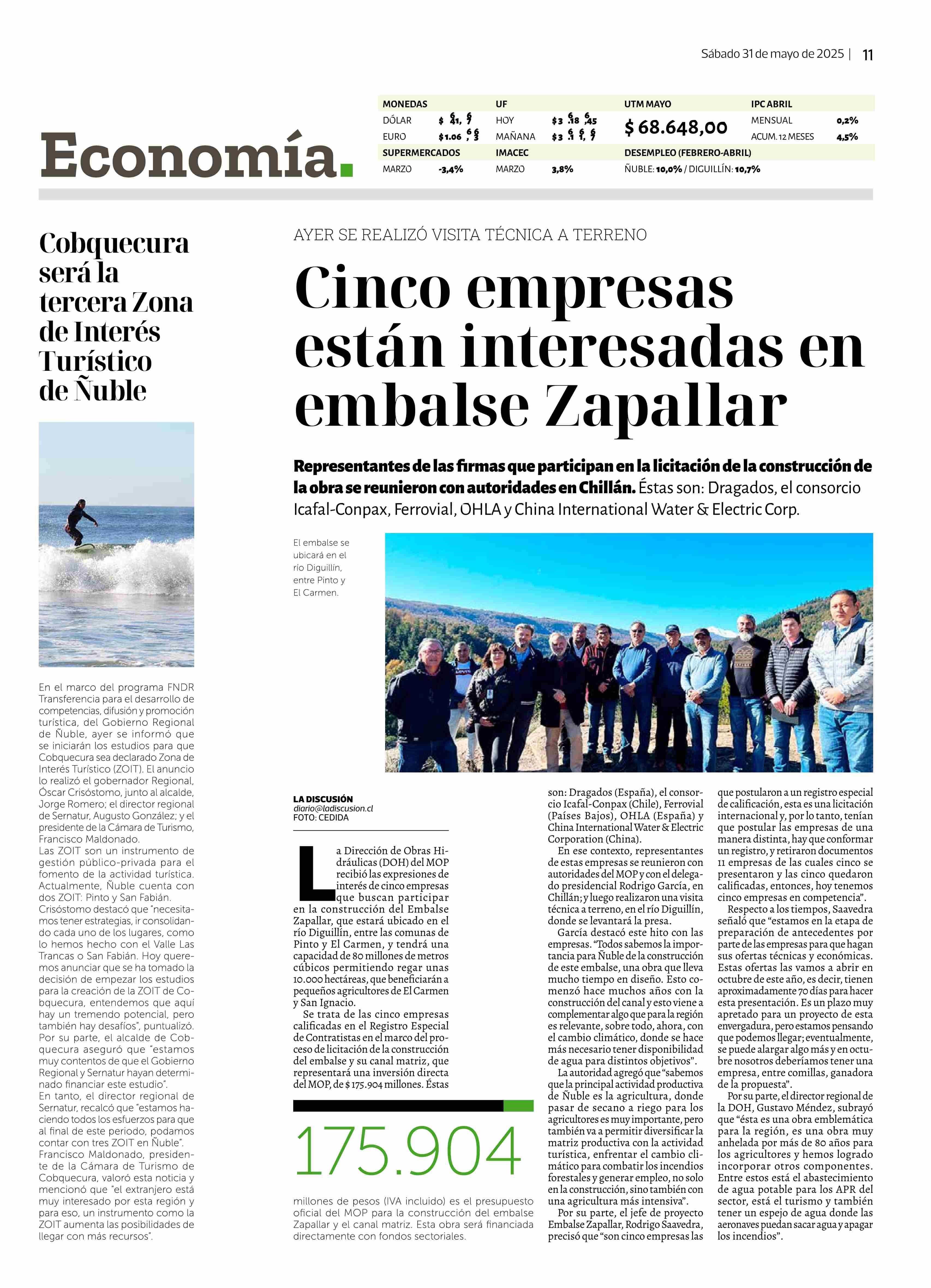 Cinco empresas están interesadas en embalse Zapallar 31-05-2025 La Discusión |