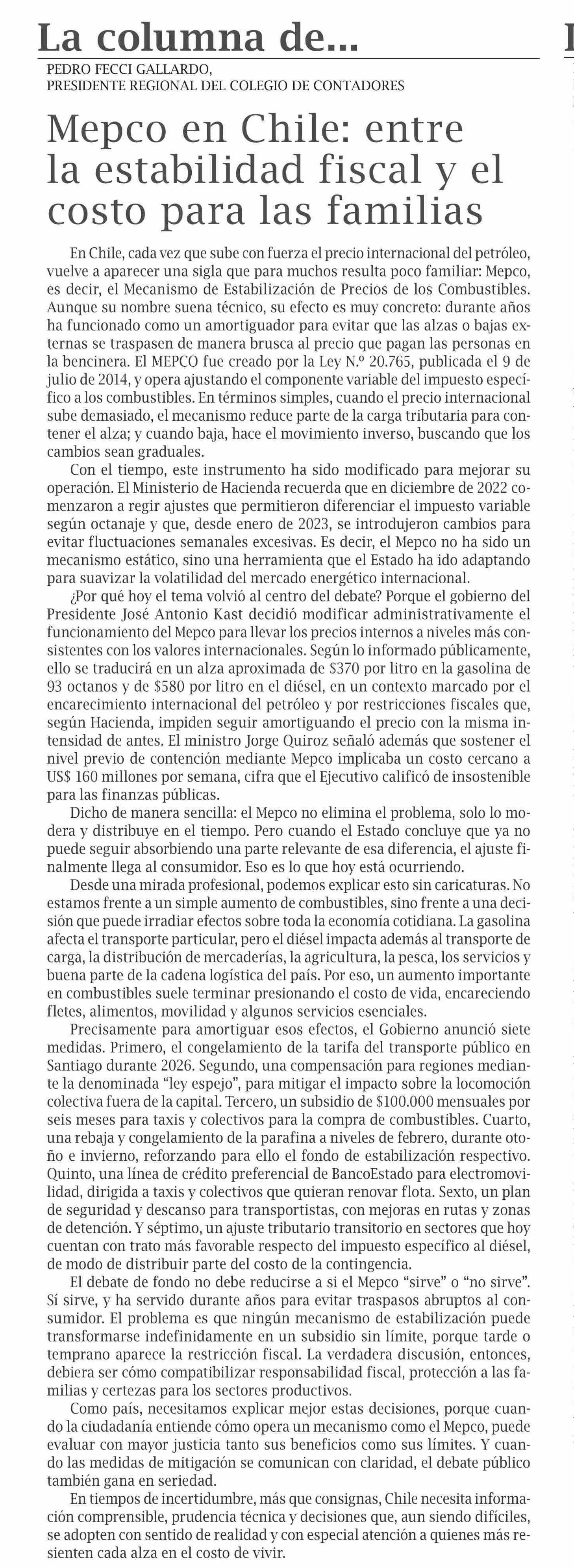 | Título: | COLUMNAS DE OPINIÓN: Mepco en Chile entre la estabilidad fiscal y el costo para las familias |