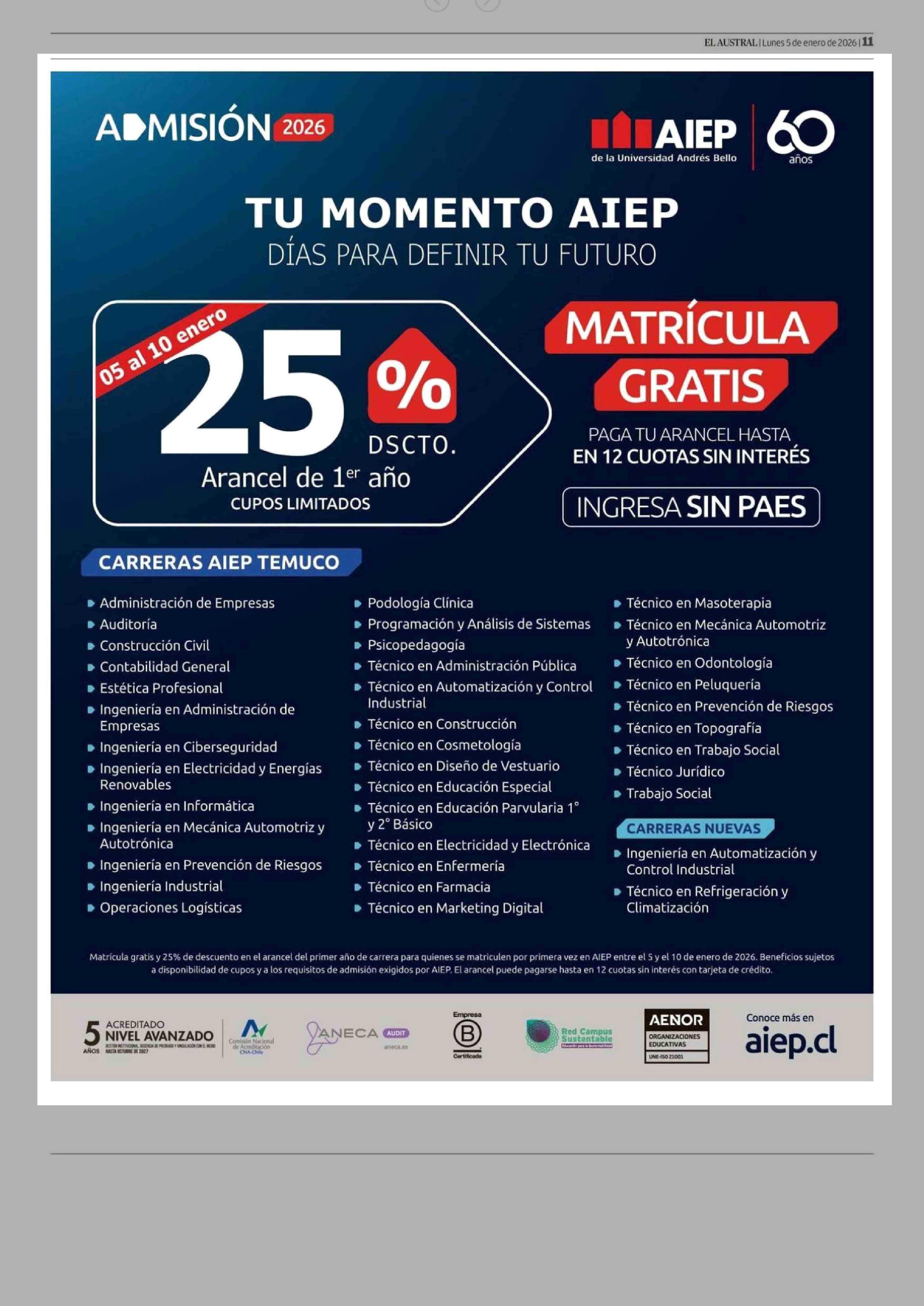 Aviso Universidad: AIEP 05-01-2026 El Austral de la Araucanía |