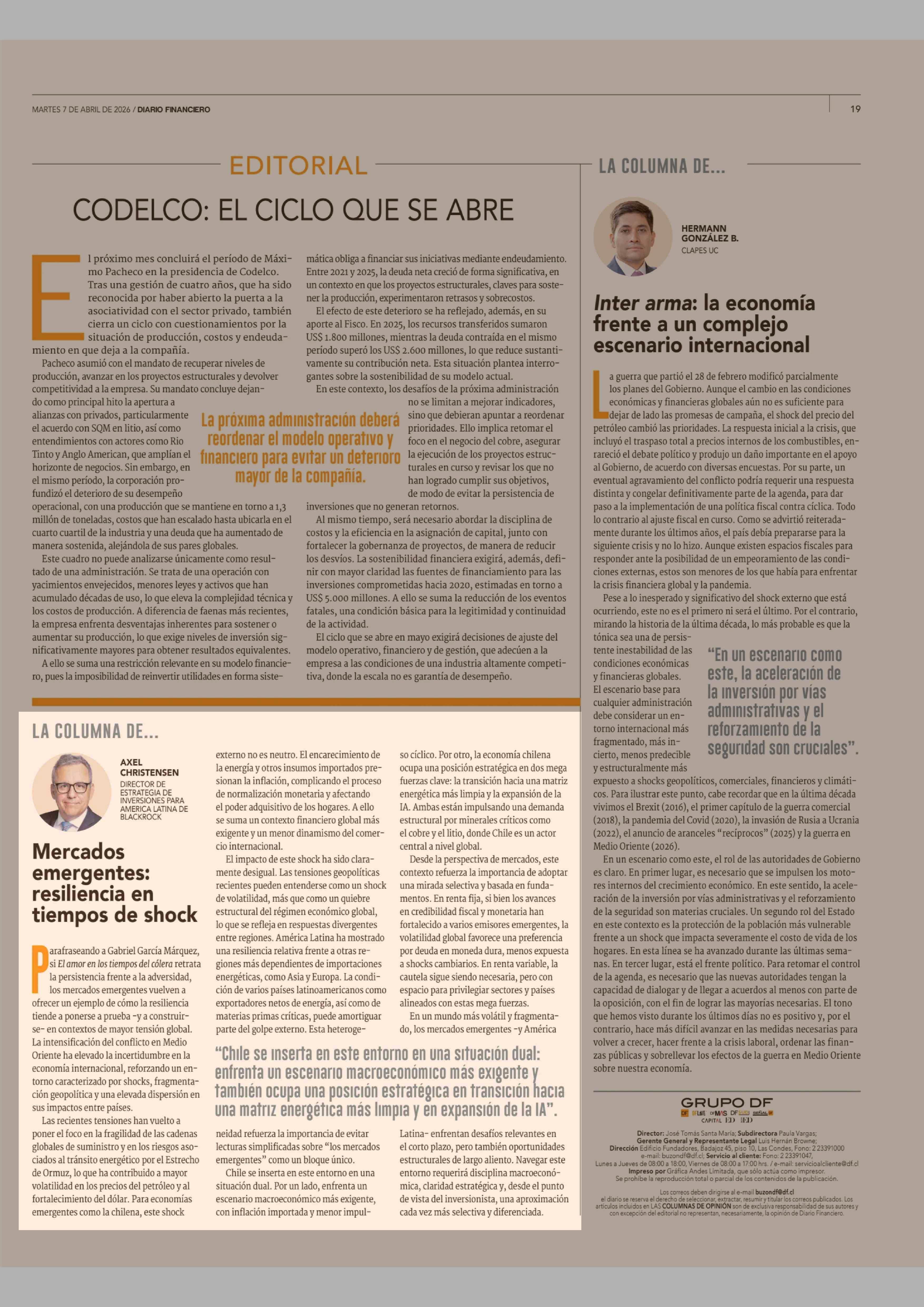 Columnas de Opinión: Mercados emergentes: resiliencia en tiempos de shock 07-04-2026 Diario Financiero |
