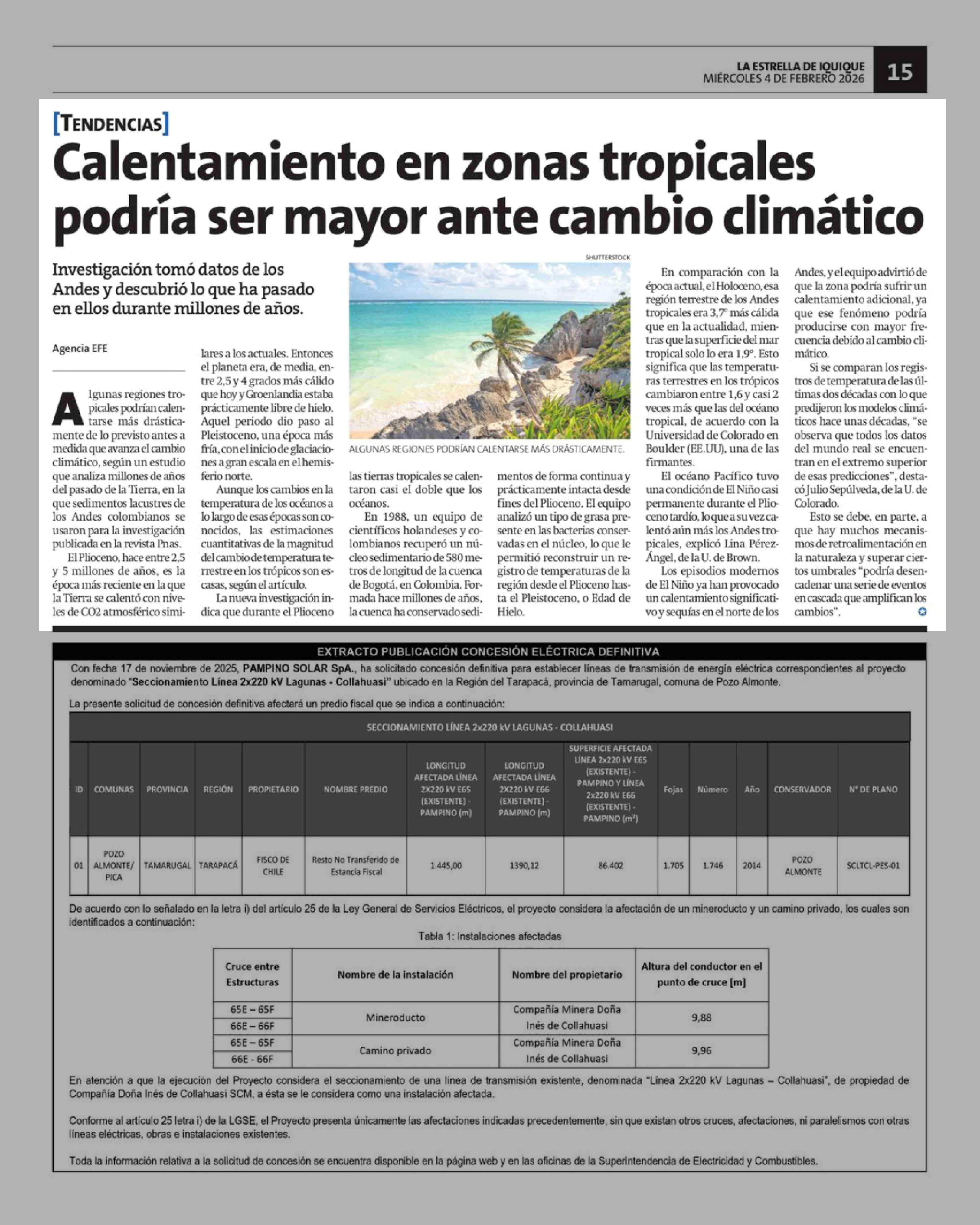 Calentamiento en zonas tropicales podría ser mayor ante cambio climático 04-02-2026 La Estrella de Iquique |