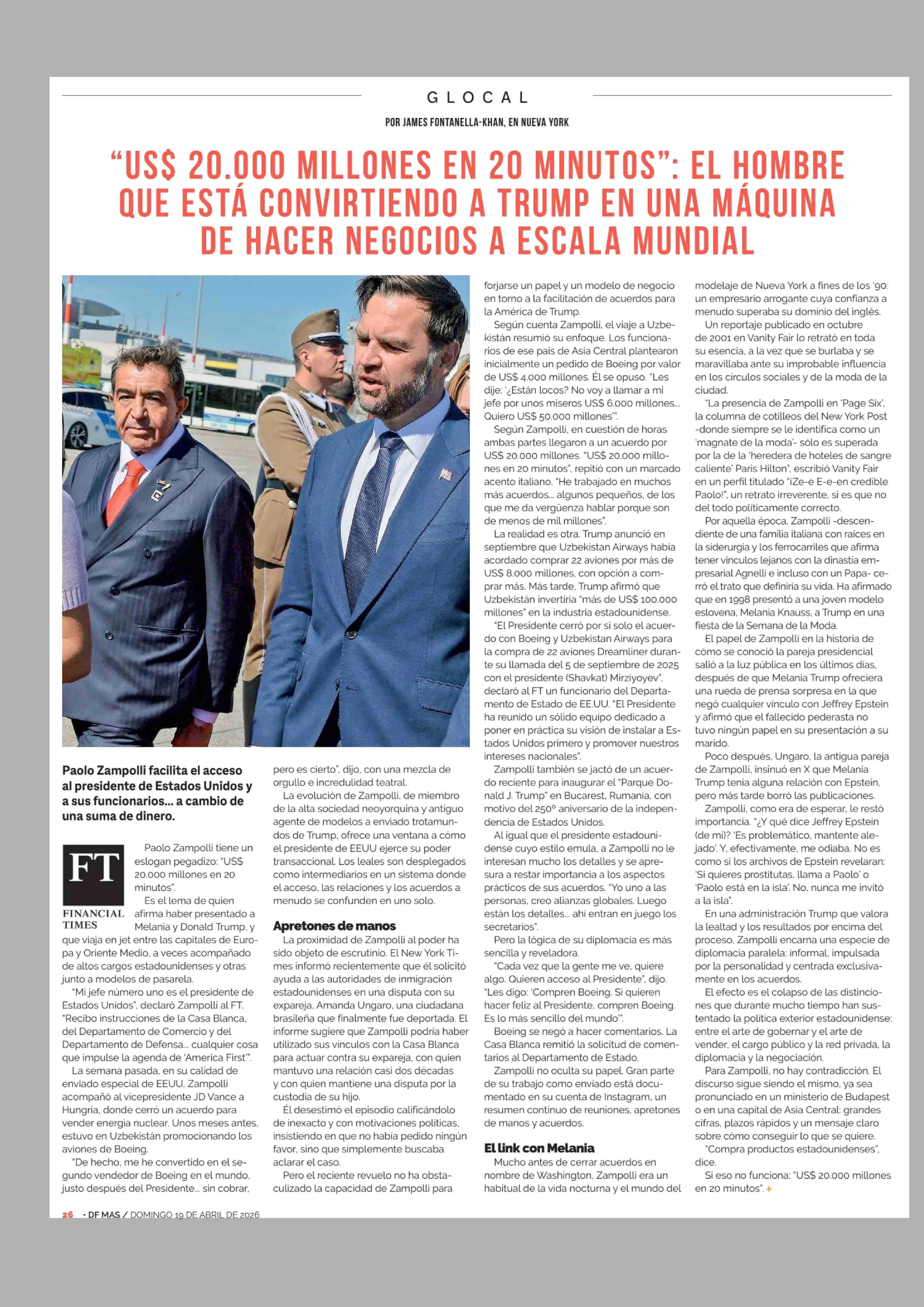 "US$ 20.000 MILLONES EN 20 MINUTOS": EL HOMBRE QUE ESTÁ CONVIRTIENDO A TRUMP EN UNA MÁQUINA DE HACER NEGOCIOS A ESCALA MUNDIAL 19-04-2026 Diario Financiero |