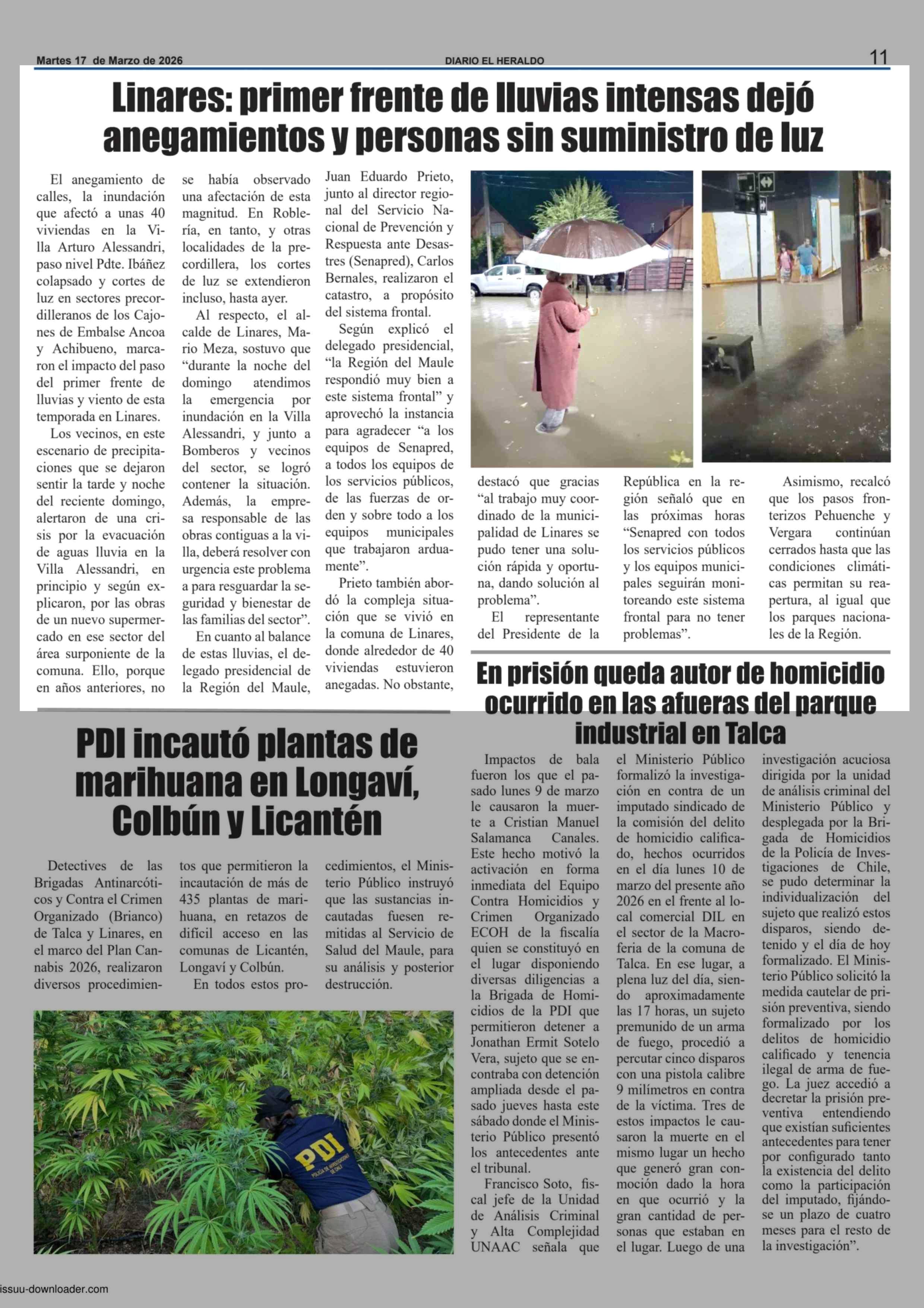 Linares: primer frente de lluvias intensas dejó anegamientos y personas sin suministro de luz 17-03-2026 El Heraldo |