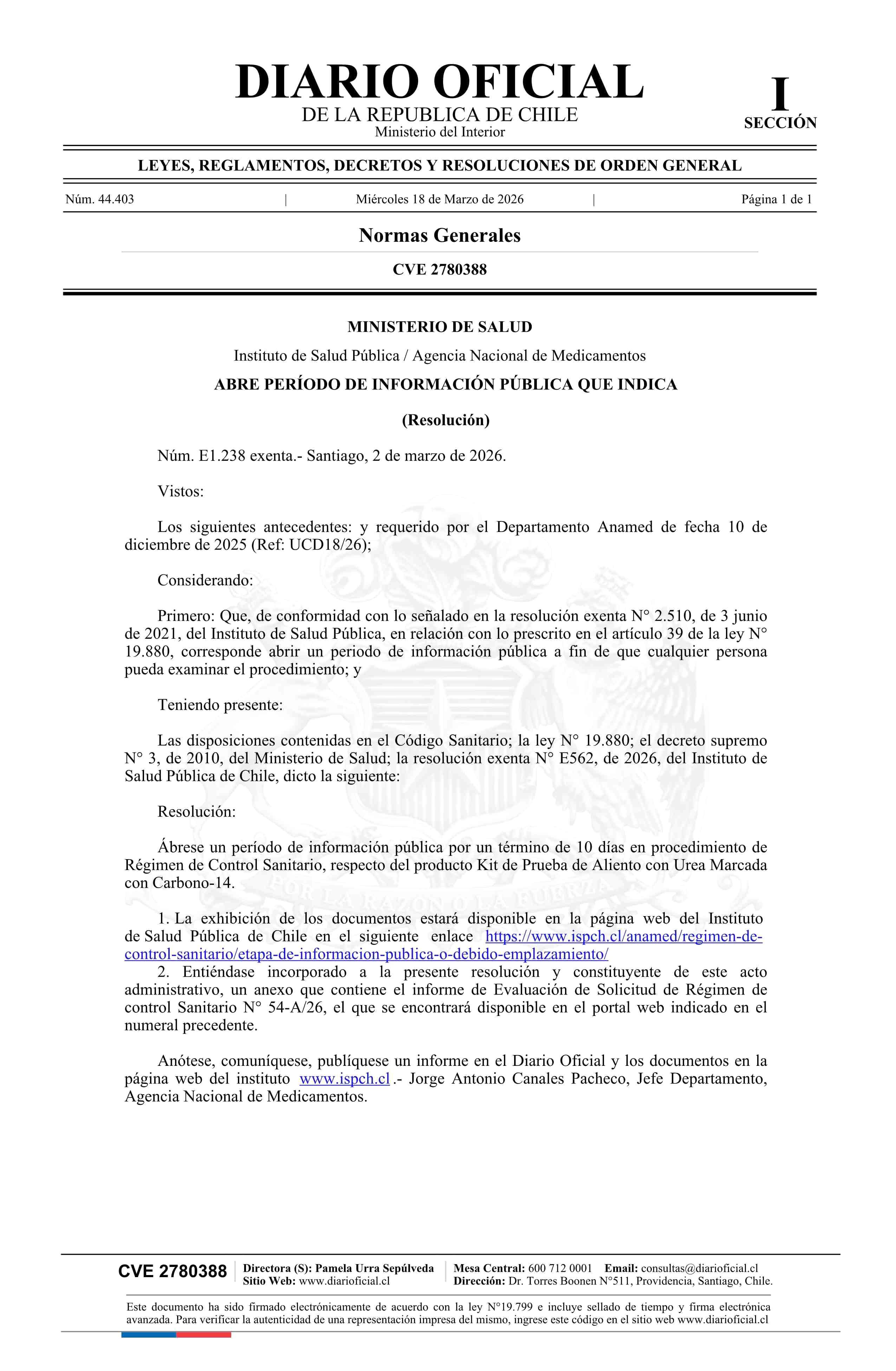 Resolución exenta número E1.238, de 2026.- Abre período de información pública que indica 18-03-2026 Diario Oficial Edición Electrónica |