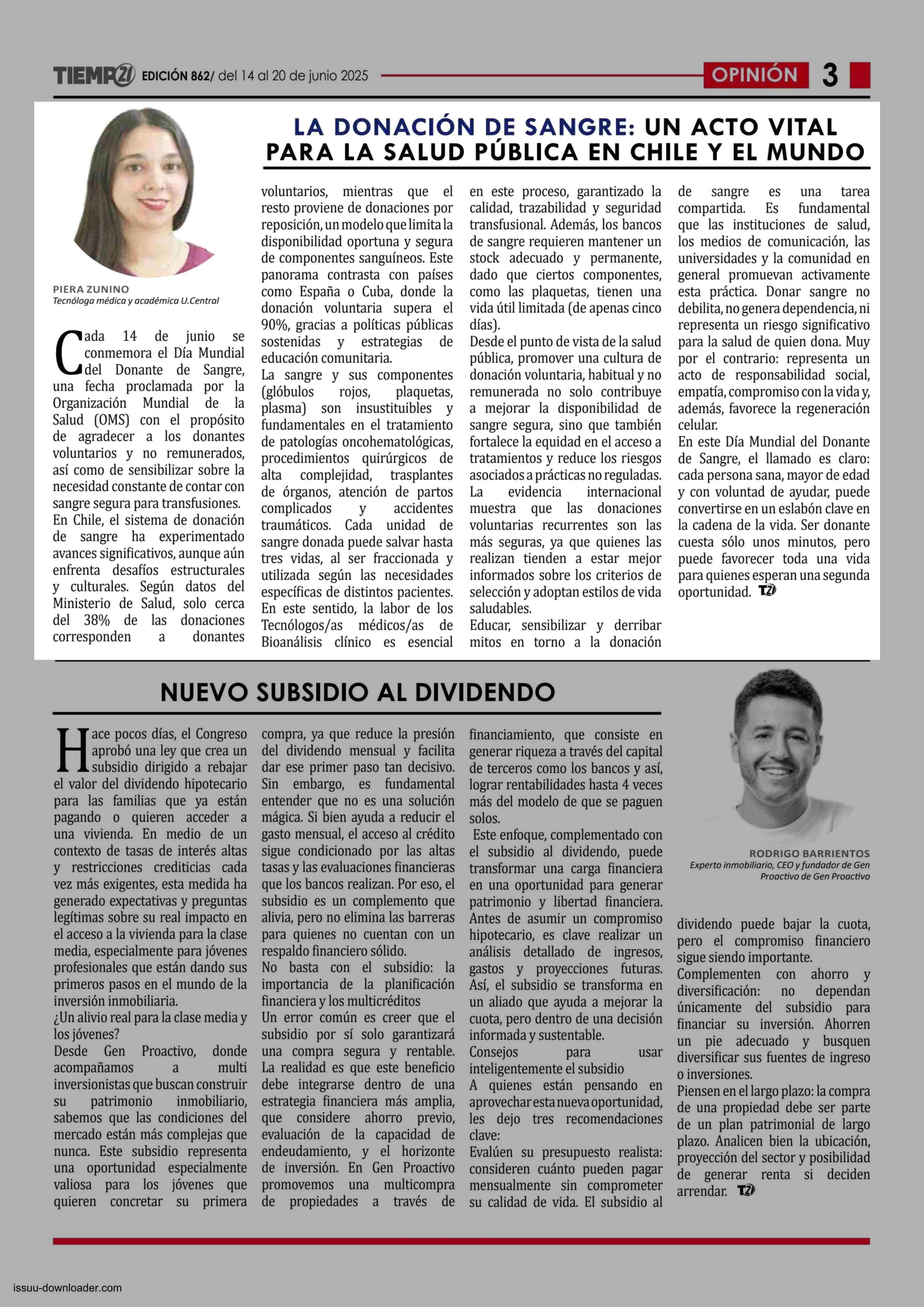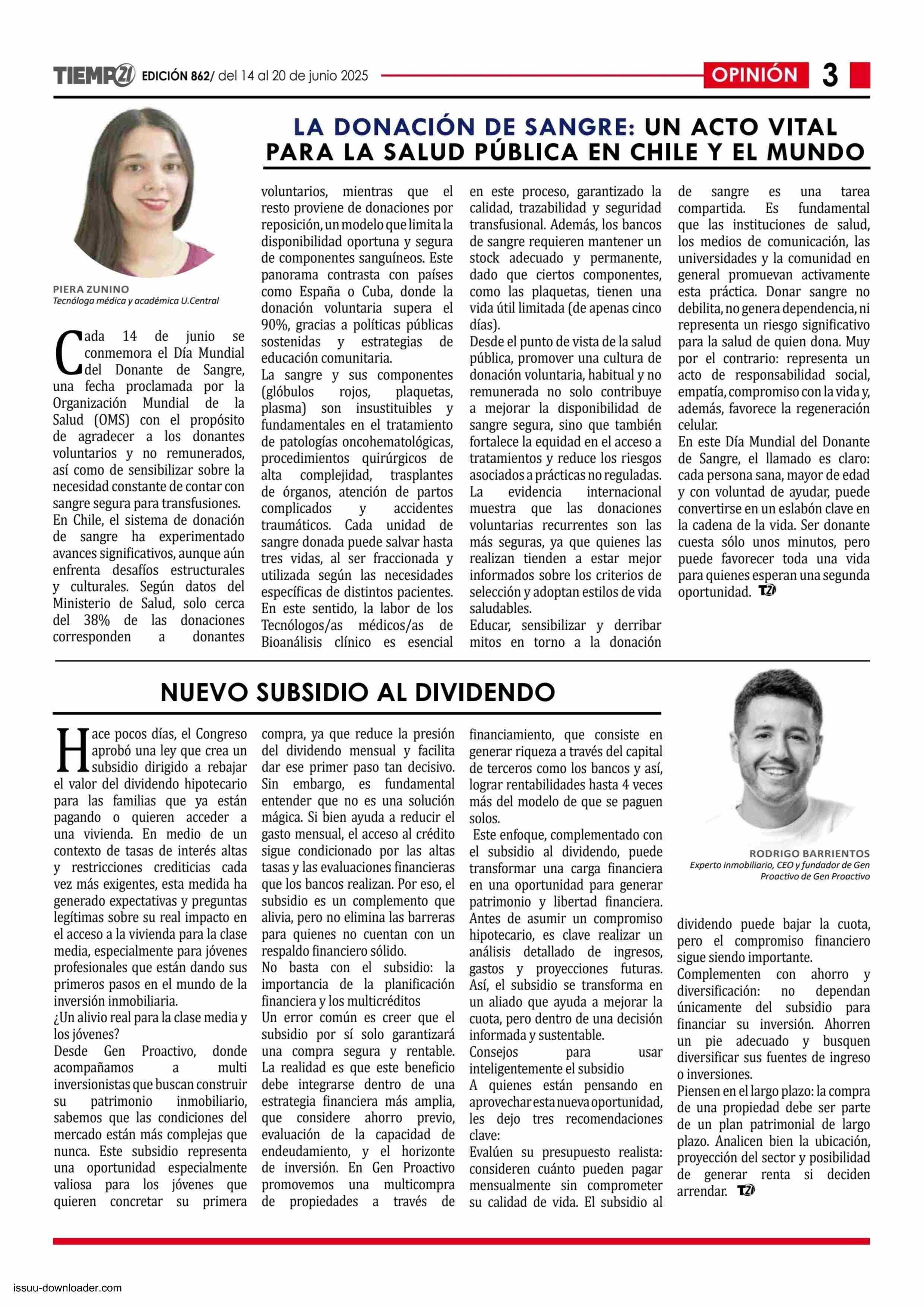 COLUMNAS DE OPINIÓN: LA DONACIÓN DE SANGRE: UN ACTO VITAL PARA LA SALUD PÚBLICA EN CHILE Y EL MUNDO 14-06-2025 Tiempo 21 |