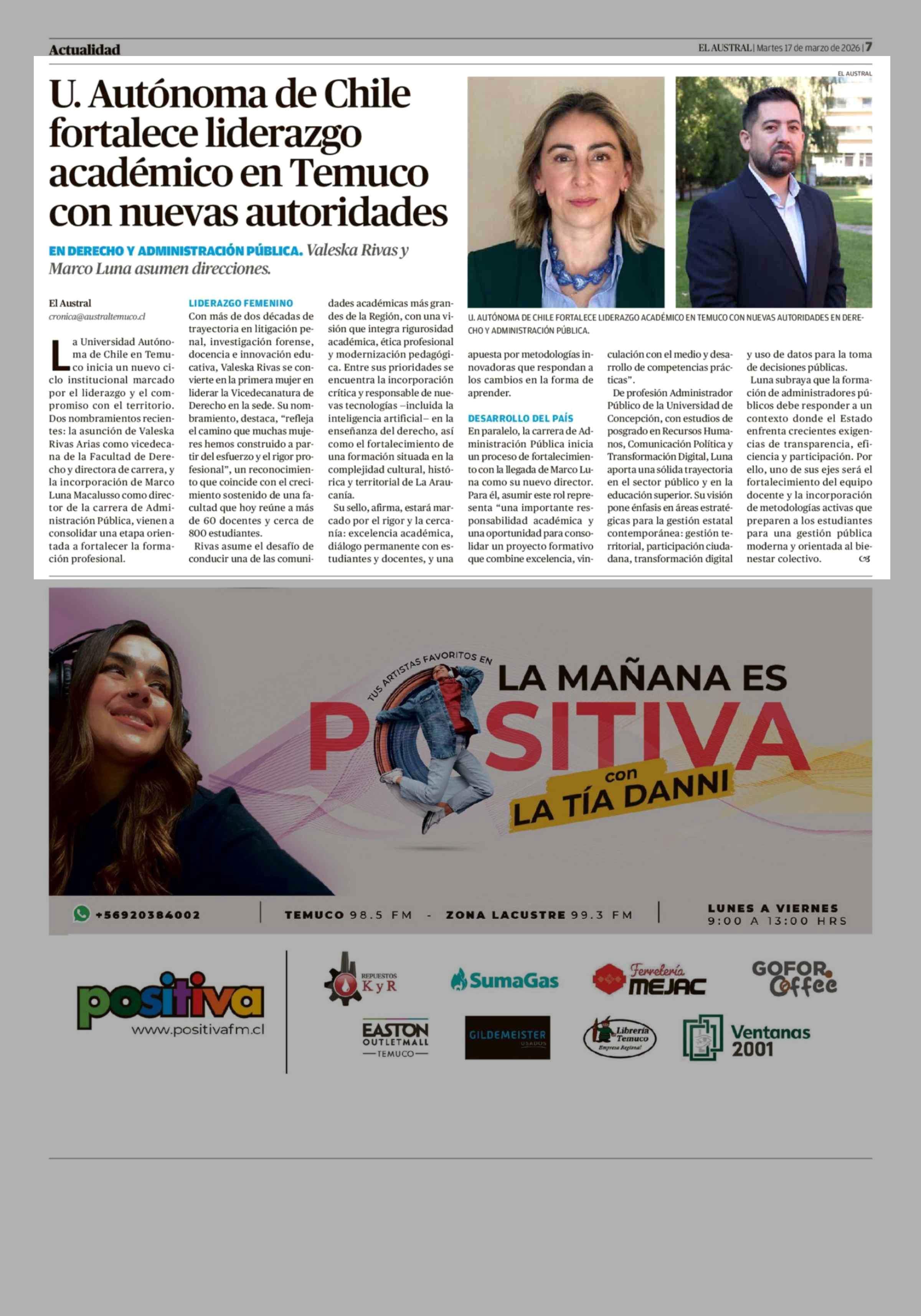 U. Autónoma de Chile fortalece liderazgo académico en Temuco con nuevas autoridades 17-03-2026 El Austral de la Araucanía |