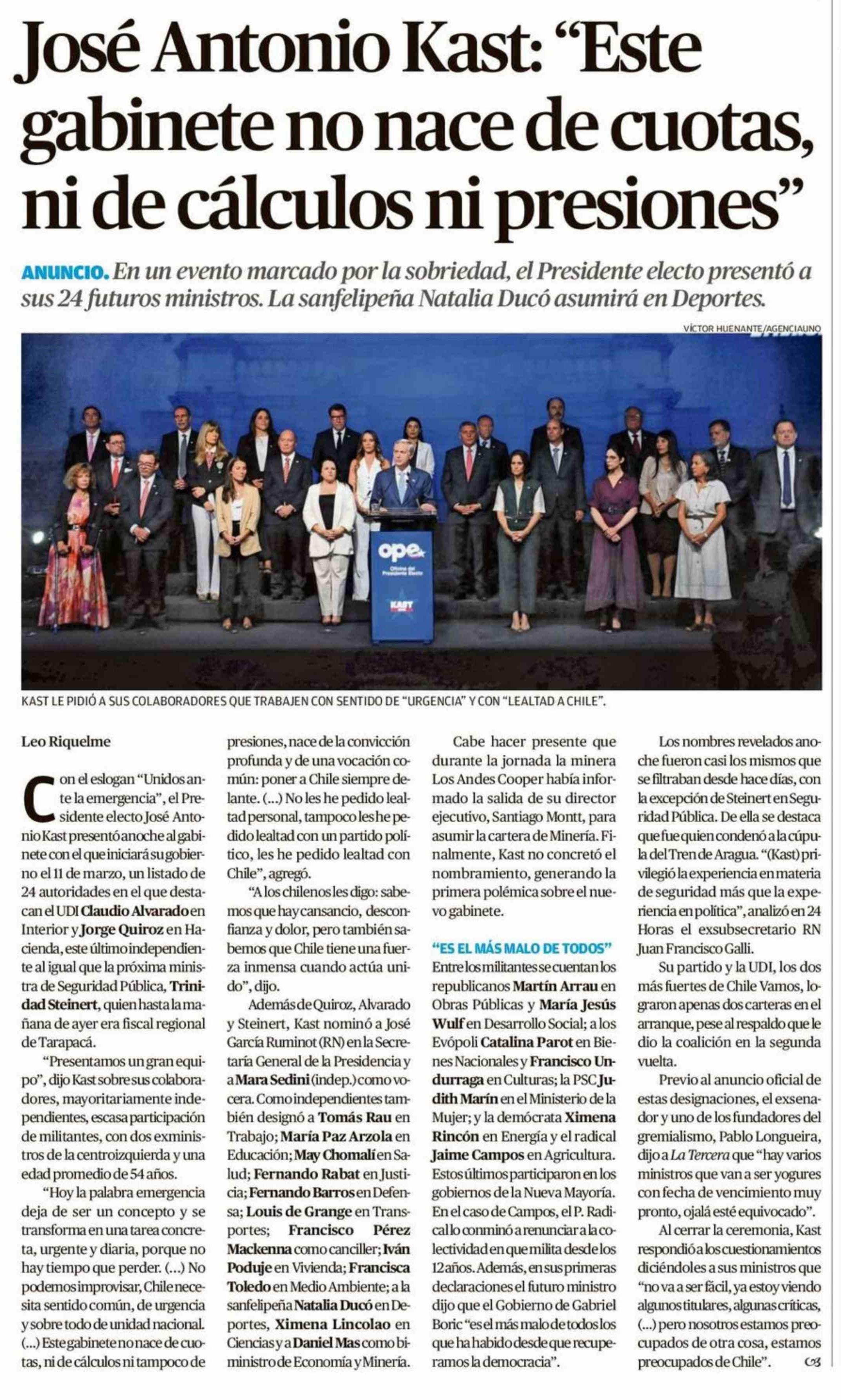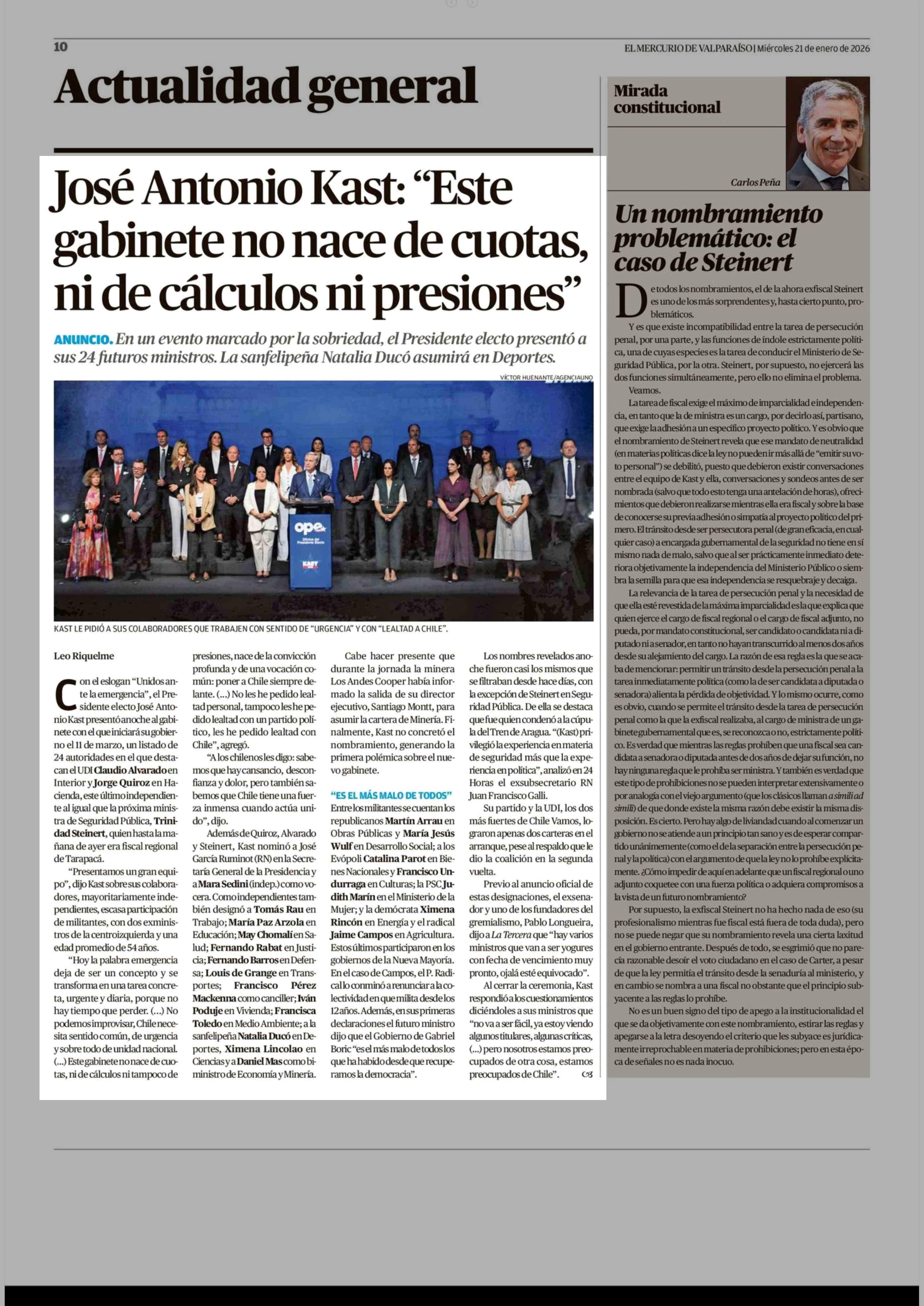 José Antonio Kast: "Este gabinete no nace de cuotas, ni de cálculos ni presiones" 21-01-2026 El Mercurio de Valparaíso |