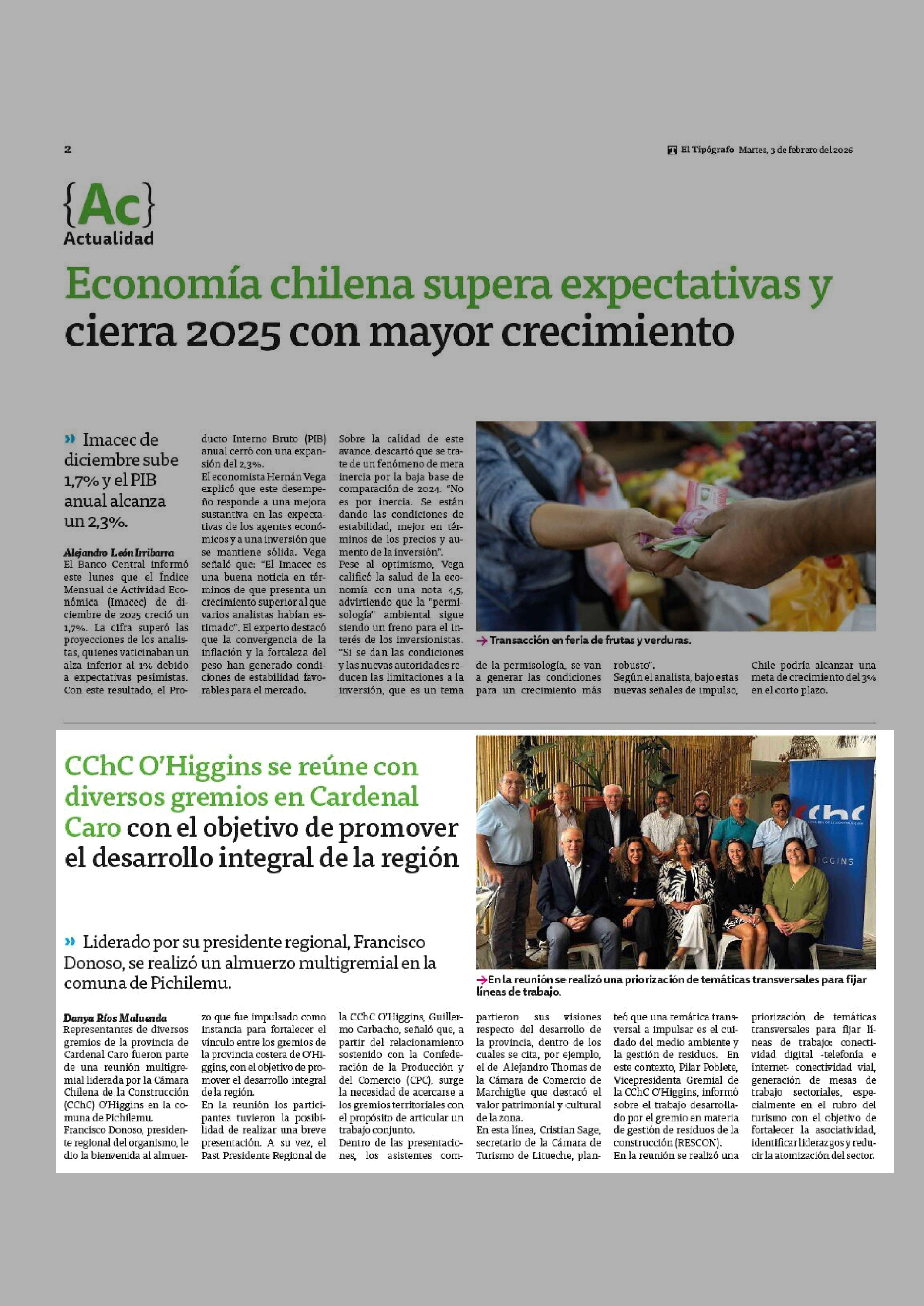 CChC O'Higgins se reúne con diversos gremios en Cardenal Caro con el objetivo de promover el desarrollo integral de la región 03-02-2026 El Tipógrafo |