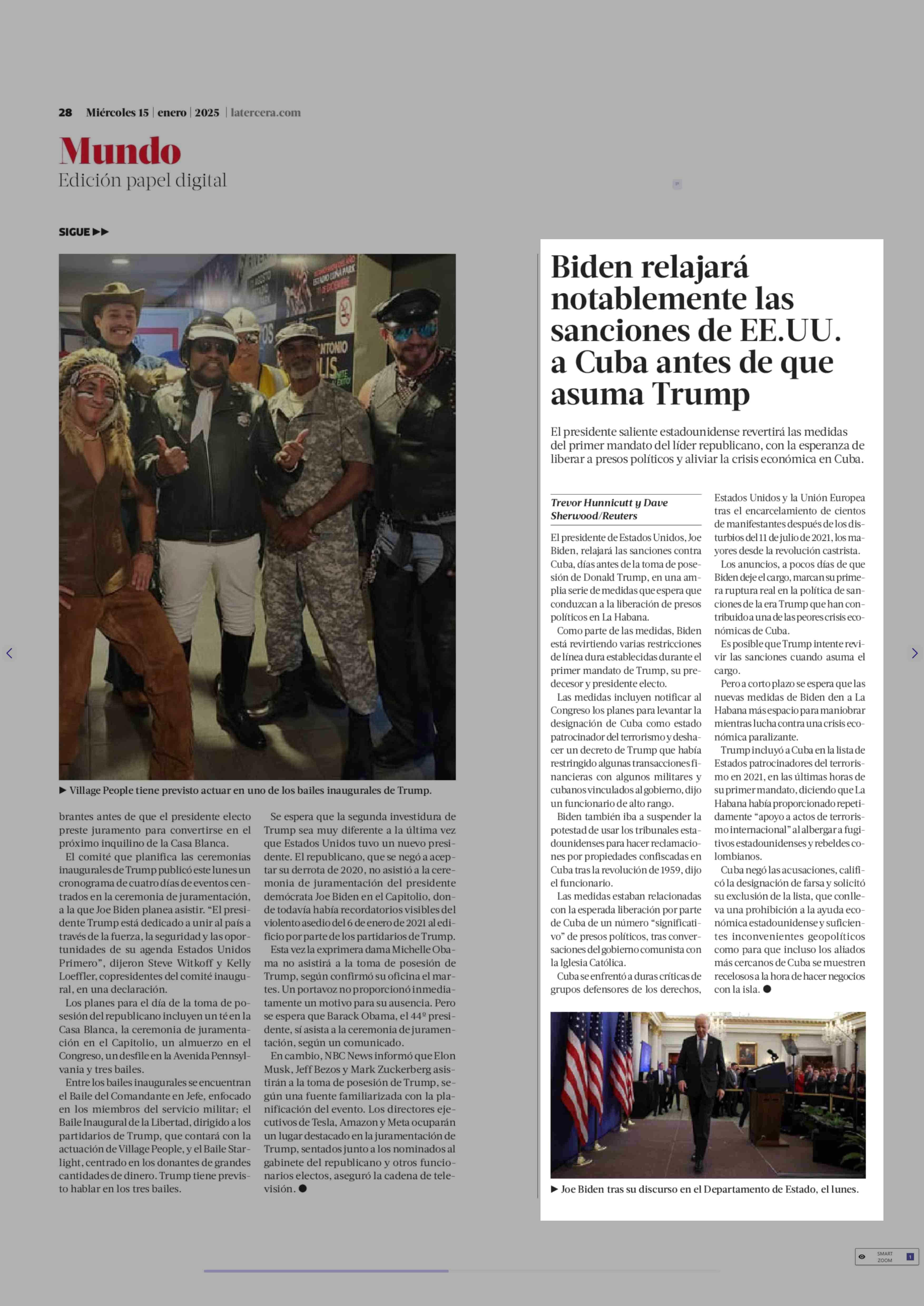 Biden relajará notablemente las sanciones de EE.UU. a Cuba antes de que asuma Trump 15-01-2025 La Tercera |