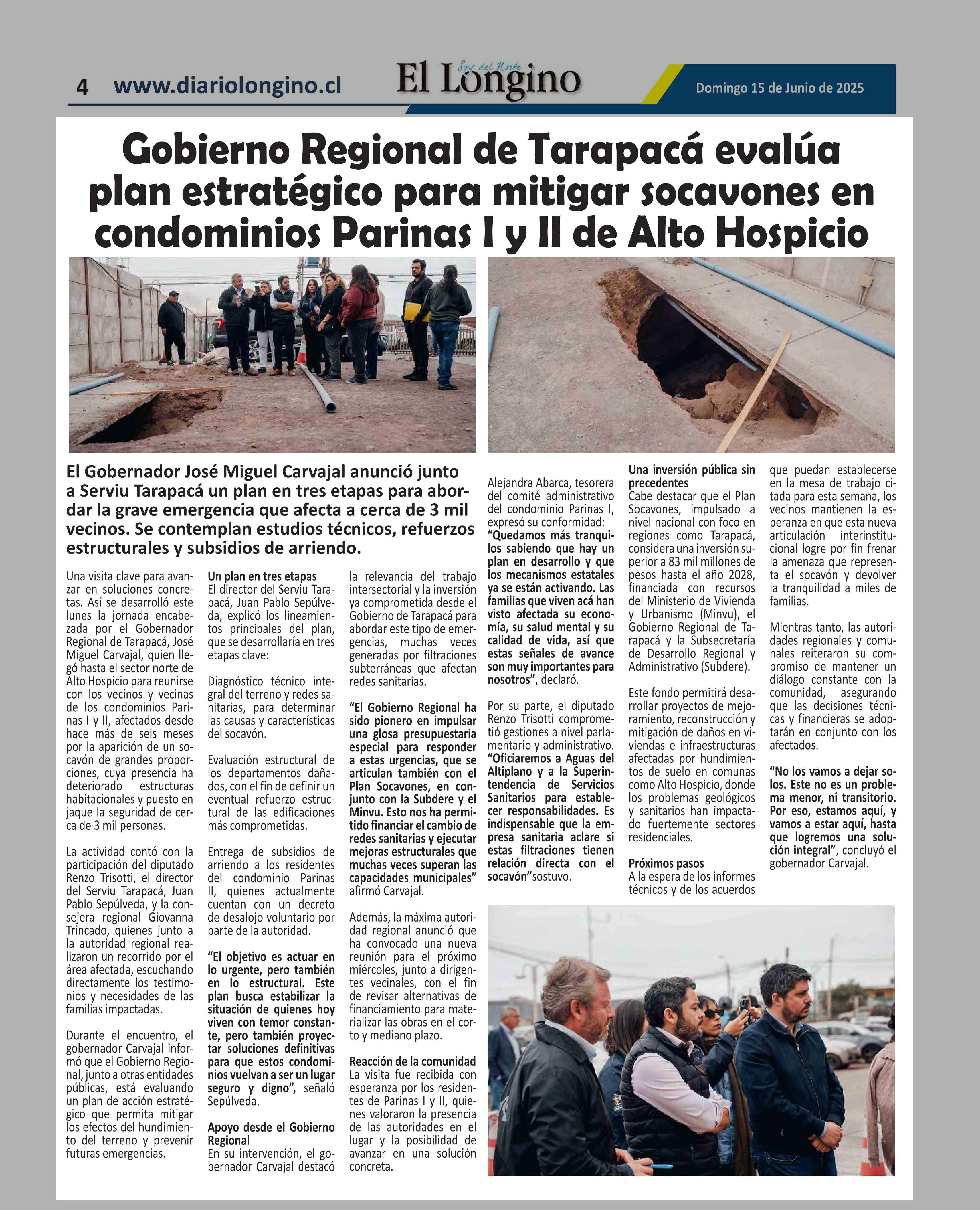 Gobierno Regional de Tarapacá evalúa plan estratégico para mitigar socavones en condominios Parinas I y II de Alto Hospicio 15-06-2025 El Longino |