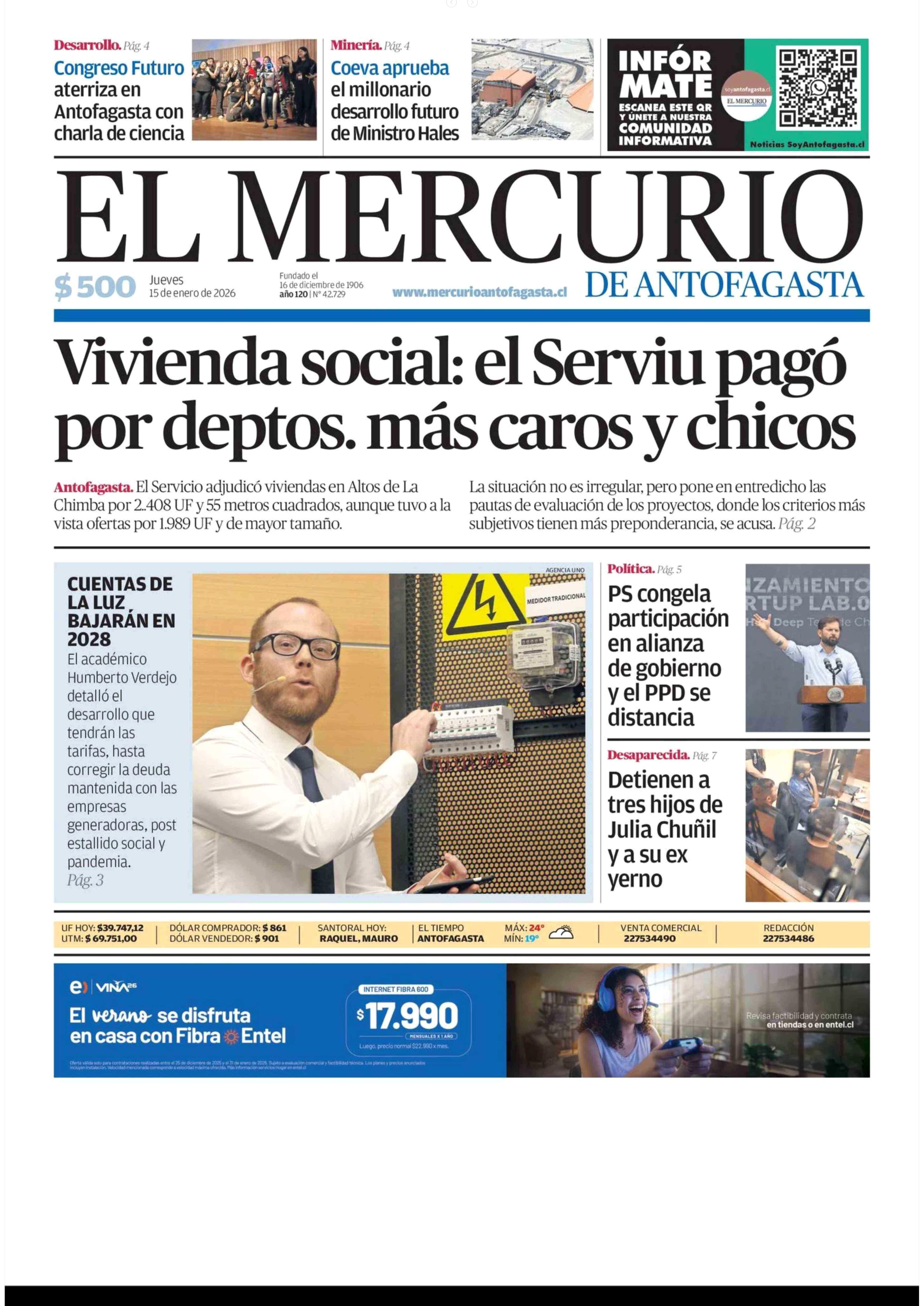 PORTADA EL MERCURIO DE ANTOFAGASTA CHILE 15-01-2026 El Mercurio de Antofagasta |