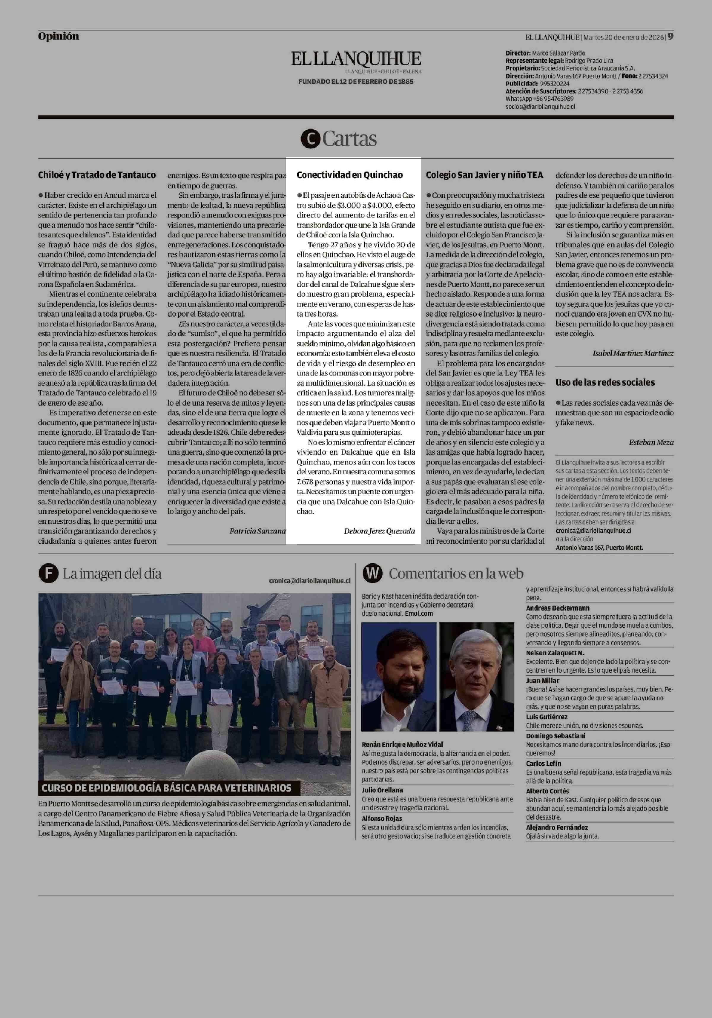 Cartas: Conectividad en Quinchao 20-01-2026 El Llanquihue |