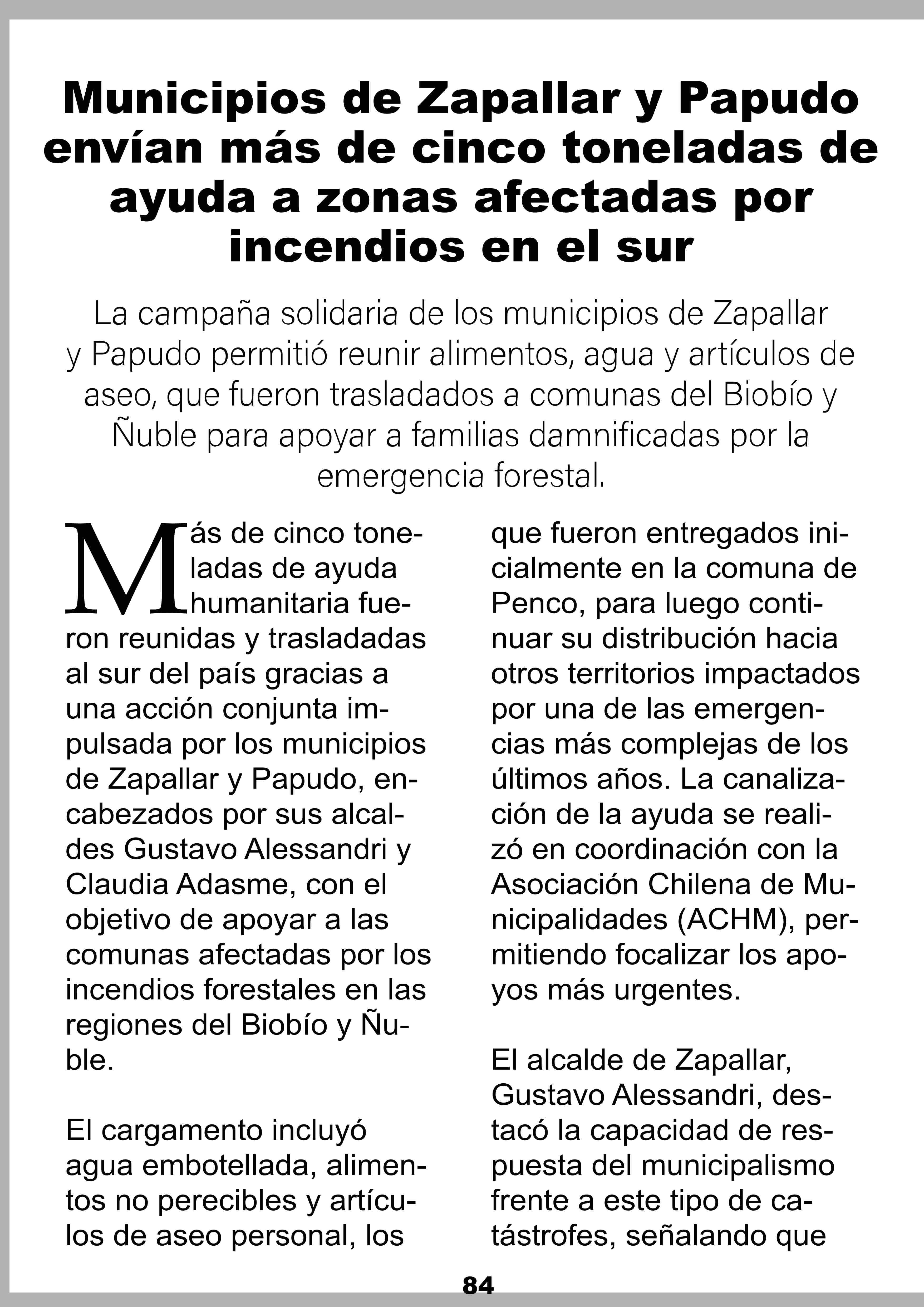 | Título: | Municipios de Zapallar y Papudo envían más de cinco toneladas de ayuda a zonas afectadas por incendios en el sur |