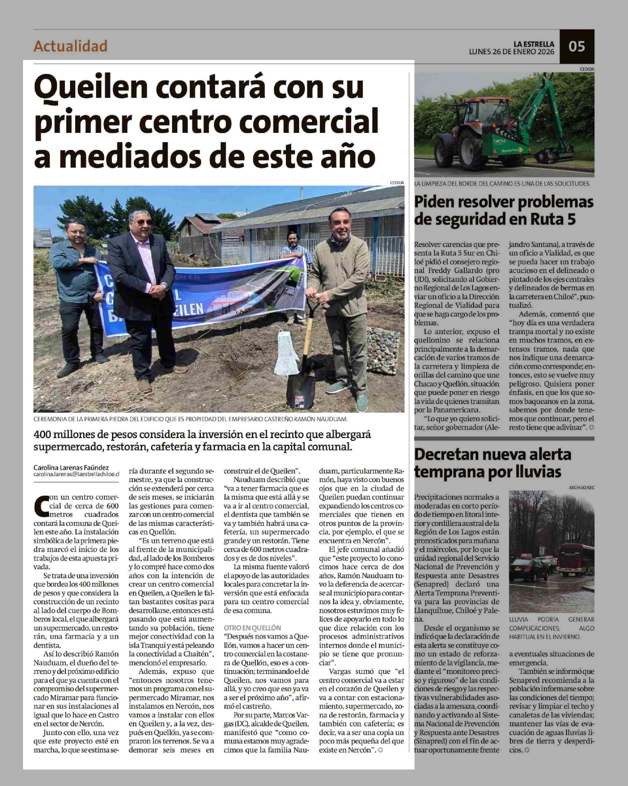 Queilen contará con su primer centro comercial a mediados de este año 26-01-2026 La Estrella de Chiloé |