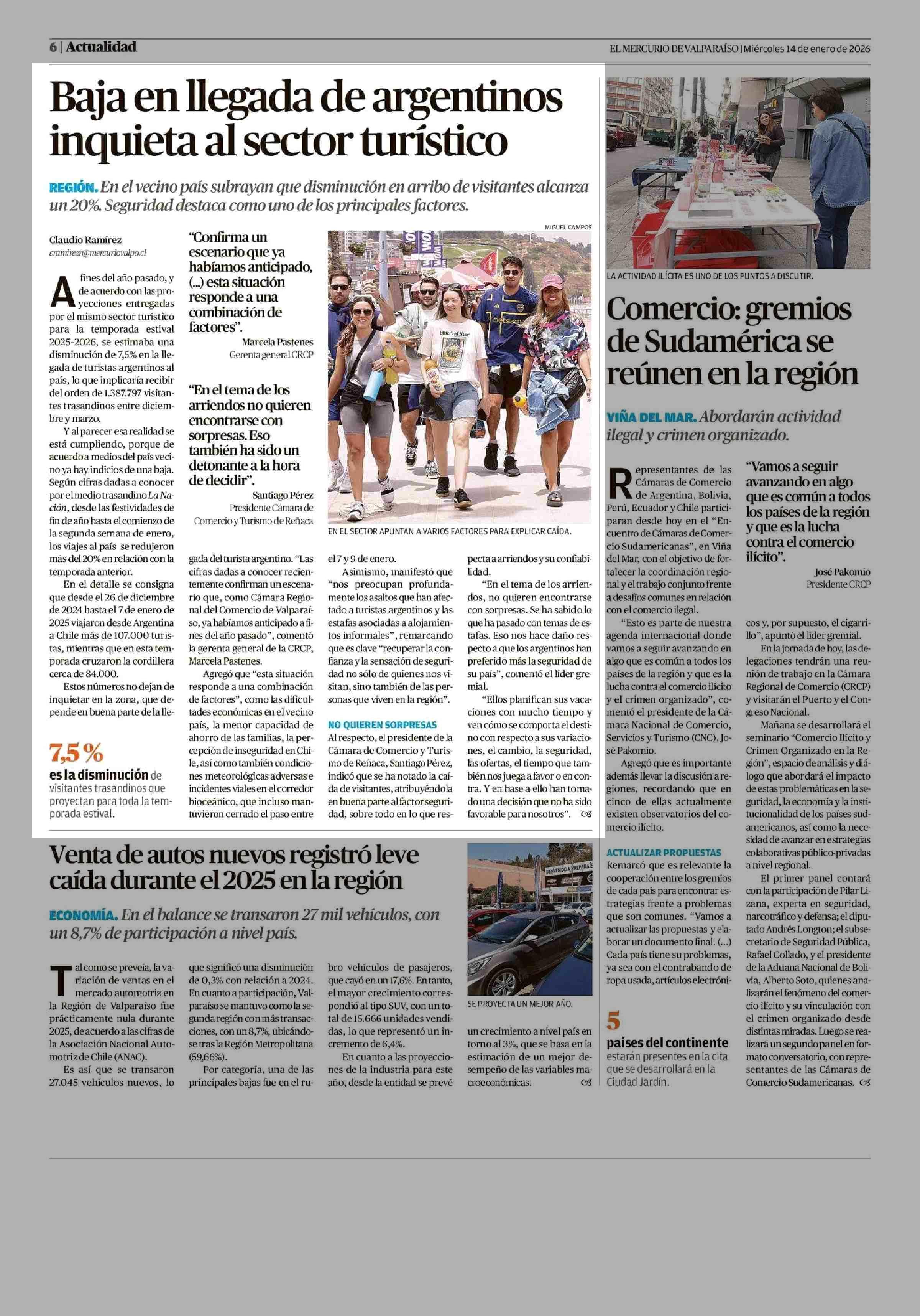 Baja en llegada de argentinos inquieta al sector turístico 14-01-2026 El Mercurio de Valparaíso |