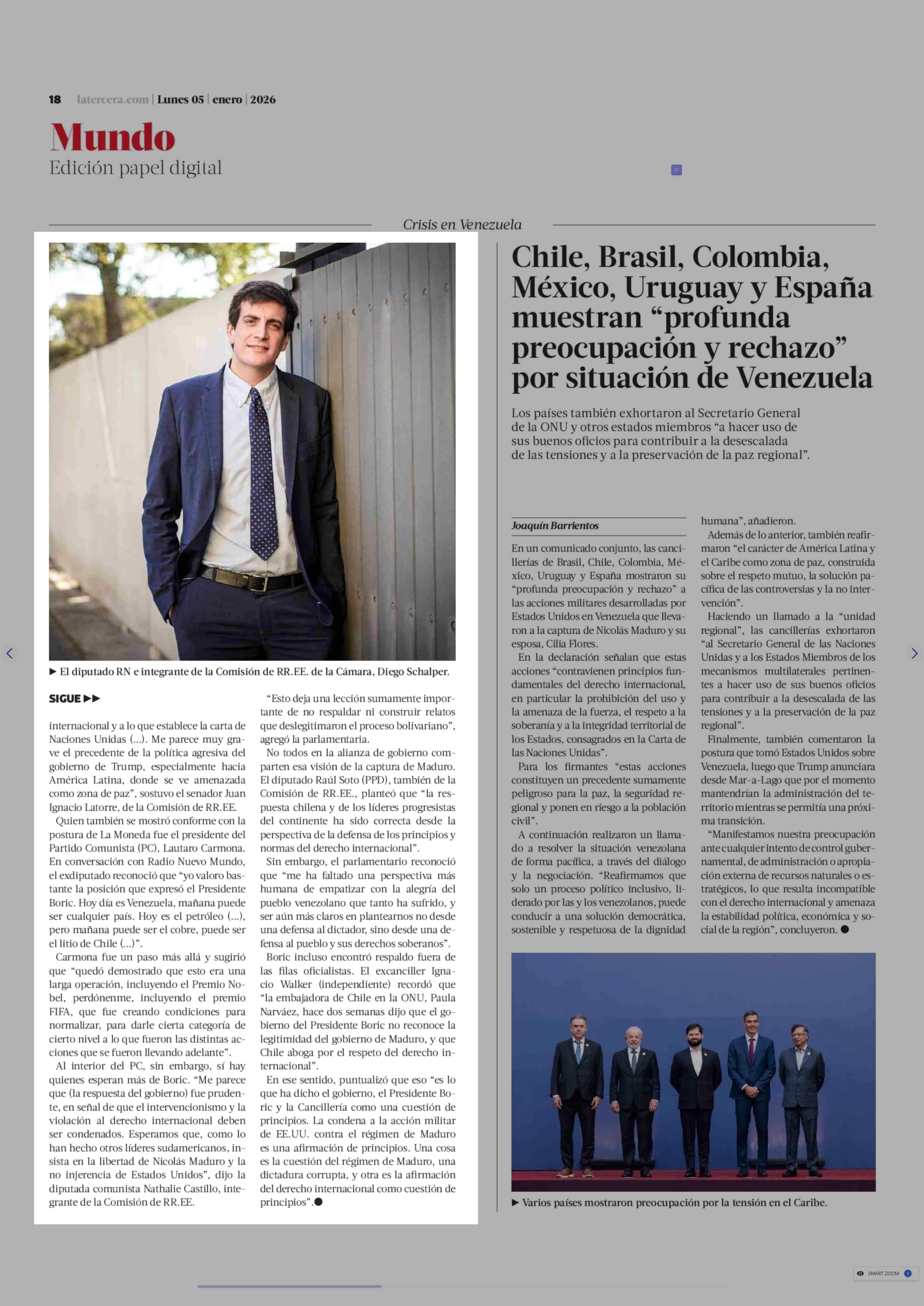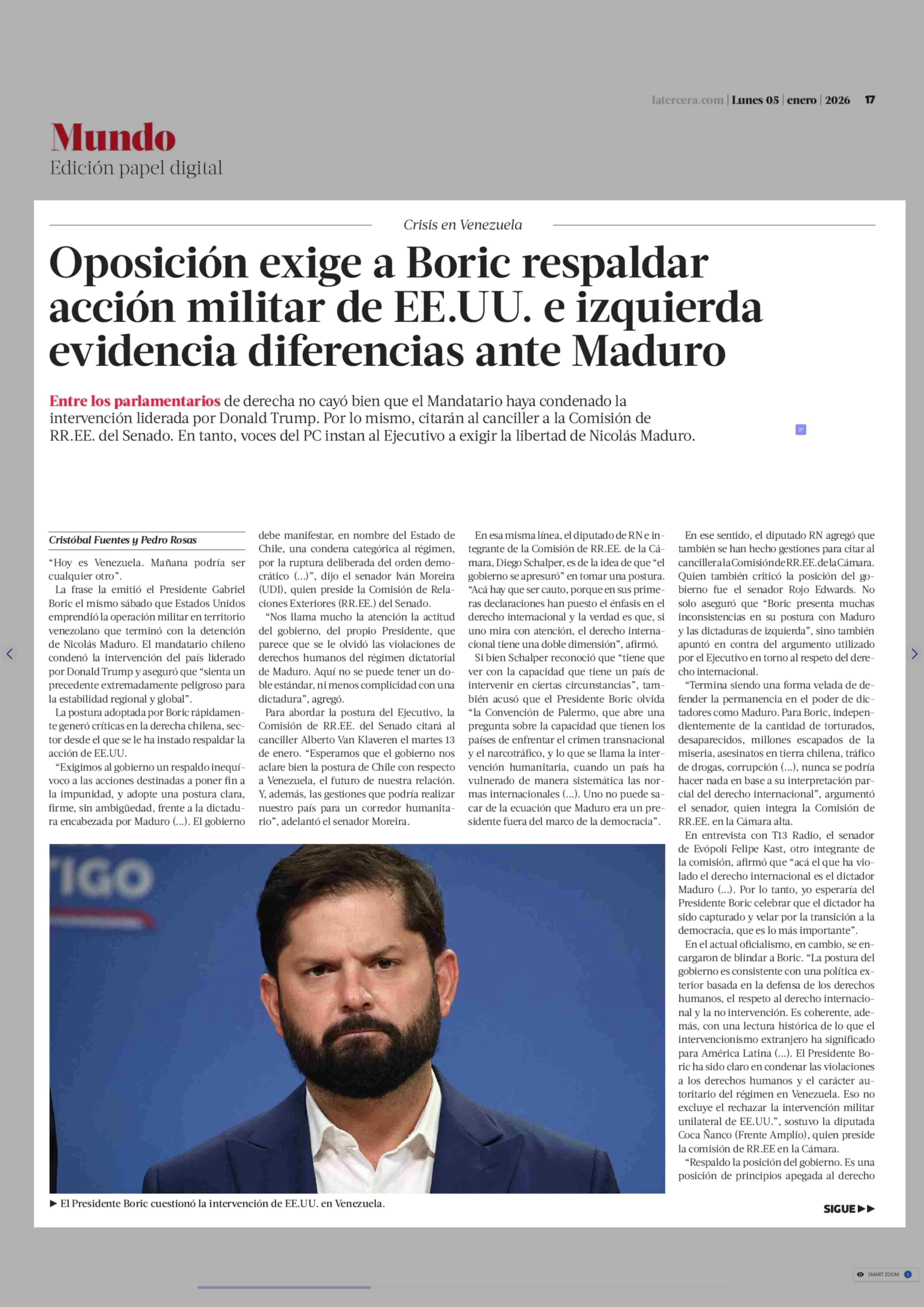 Oposición exige a Boric respaldar acción militar de EE.UU. e izquierda evidencia diferencias ante Maduro 05-01-2026 La Tercera |