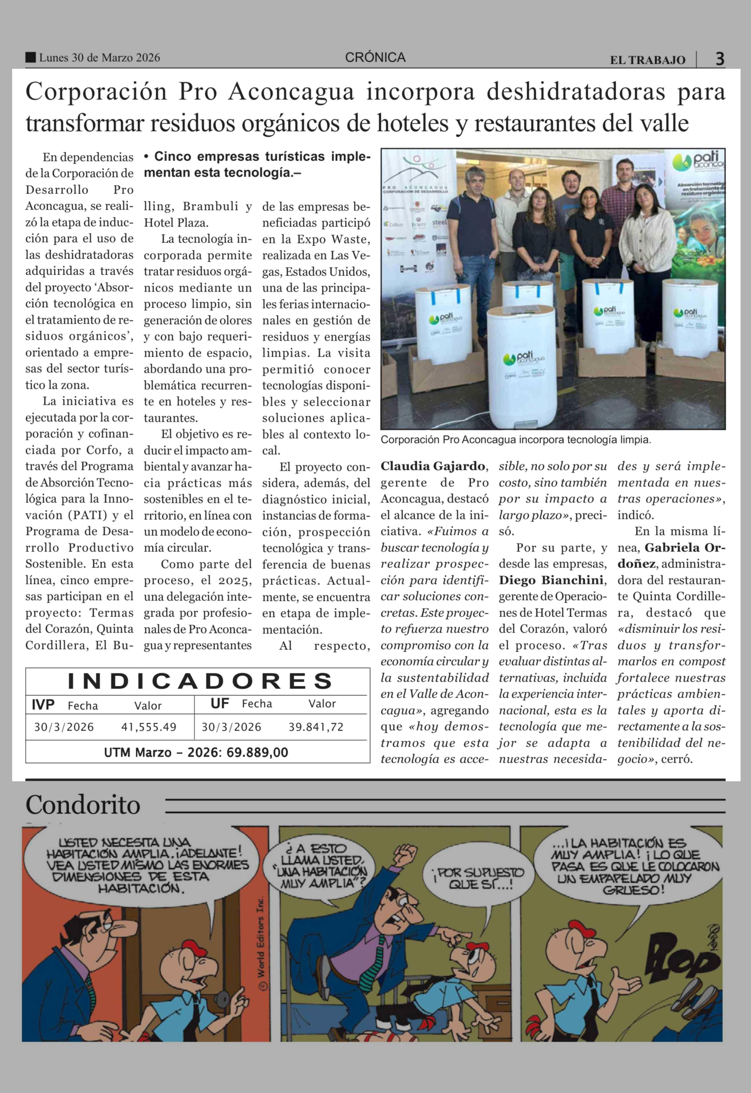 Corporación Pro Aconcagua incorpora deshidratadoras para transformar residuos orgánicos de hoteles y restaurantes del valle 30-03-2026 El Trabajo |