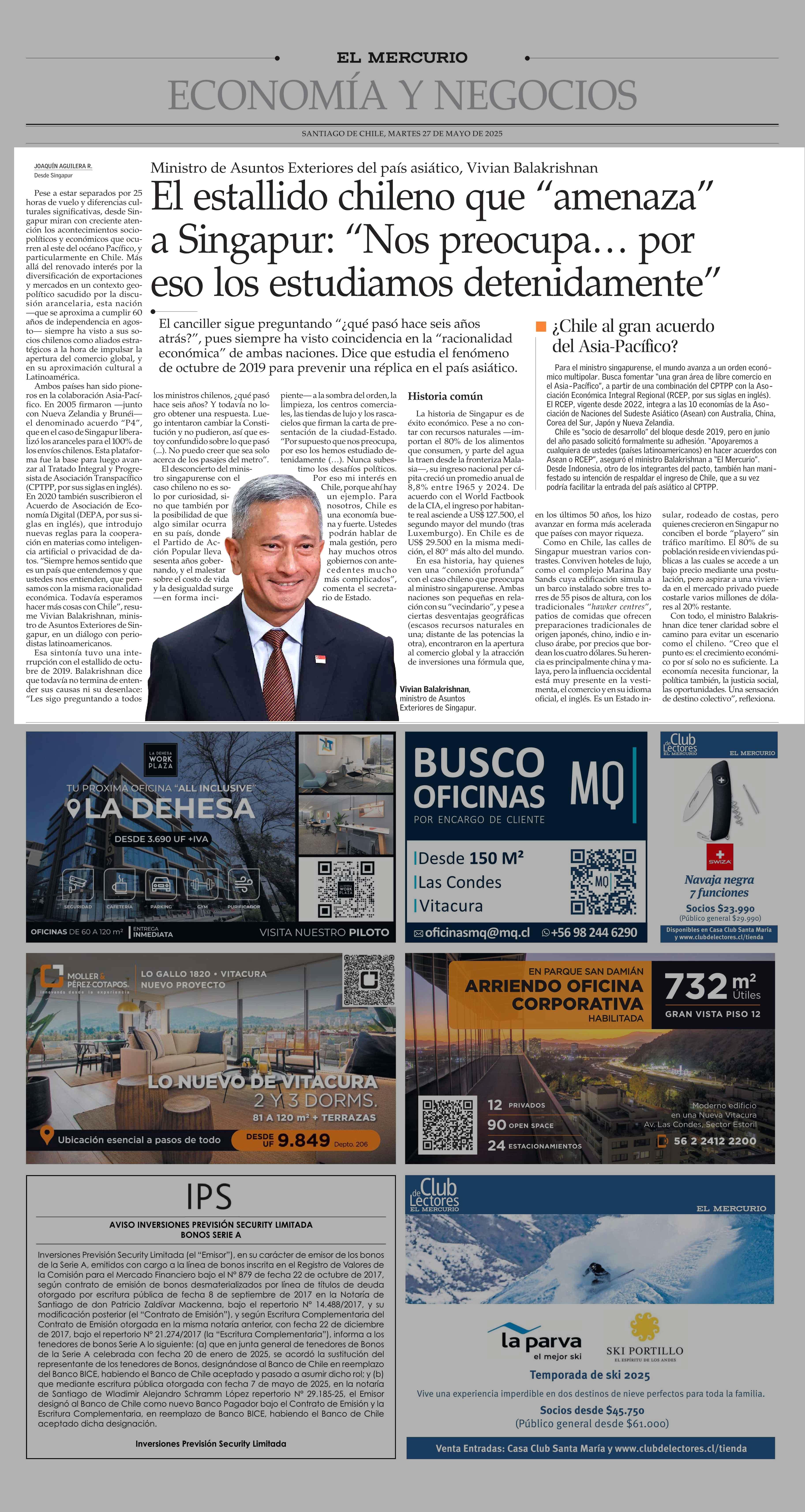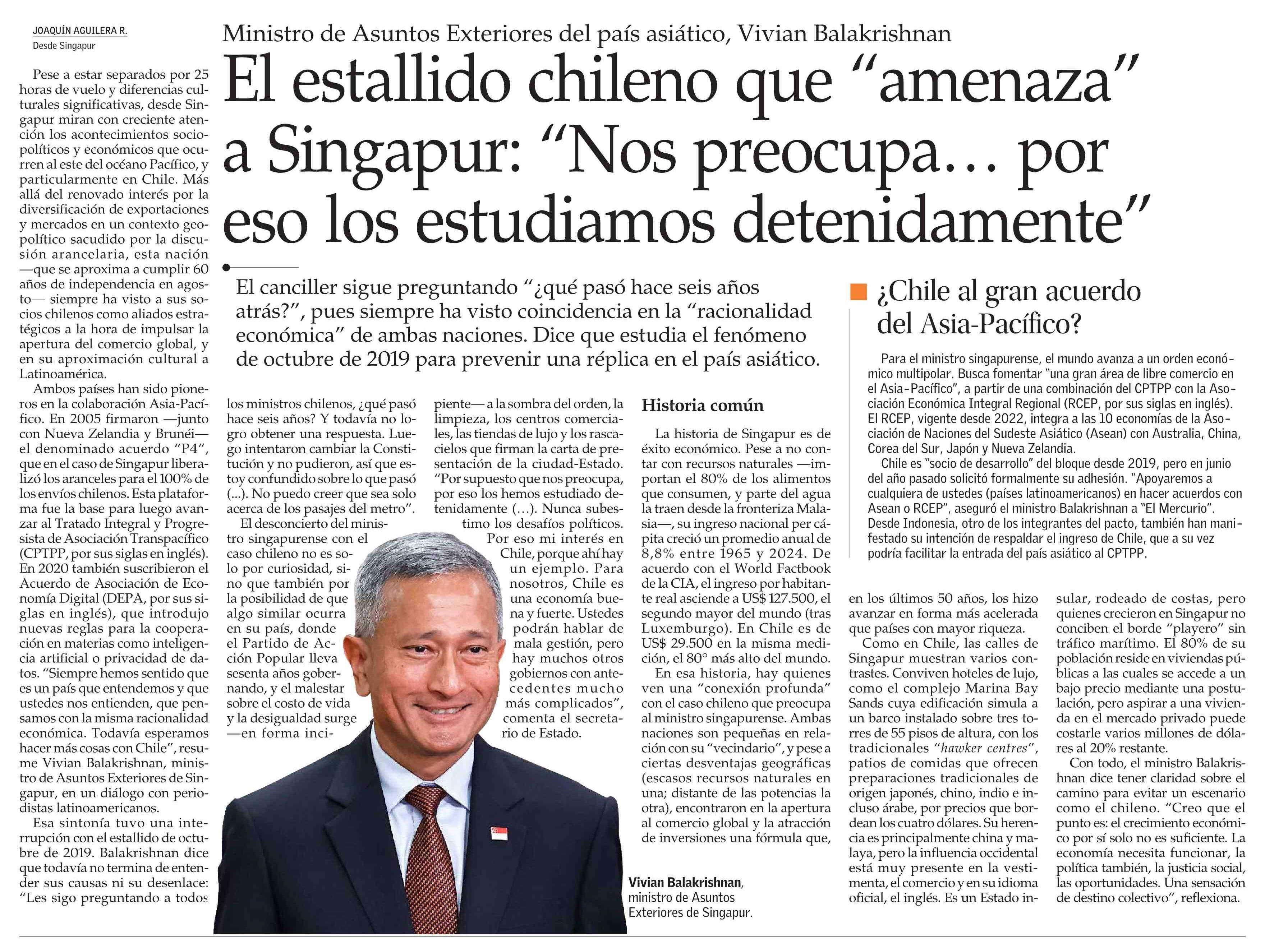 El estallido chileno que "amenaza" a Singapur: "Nos preocupa... por eso los estudiamos detenidamente" 27-05-2025 El Mercurio |