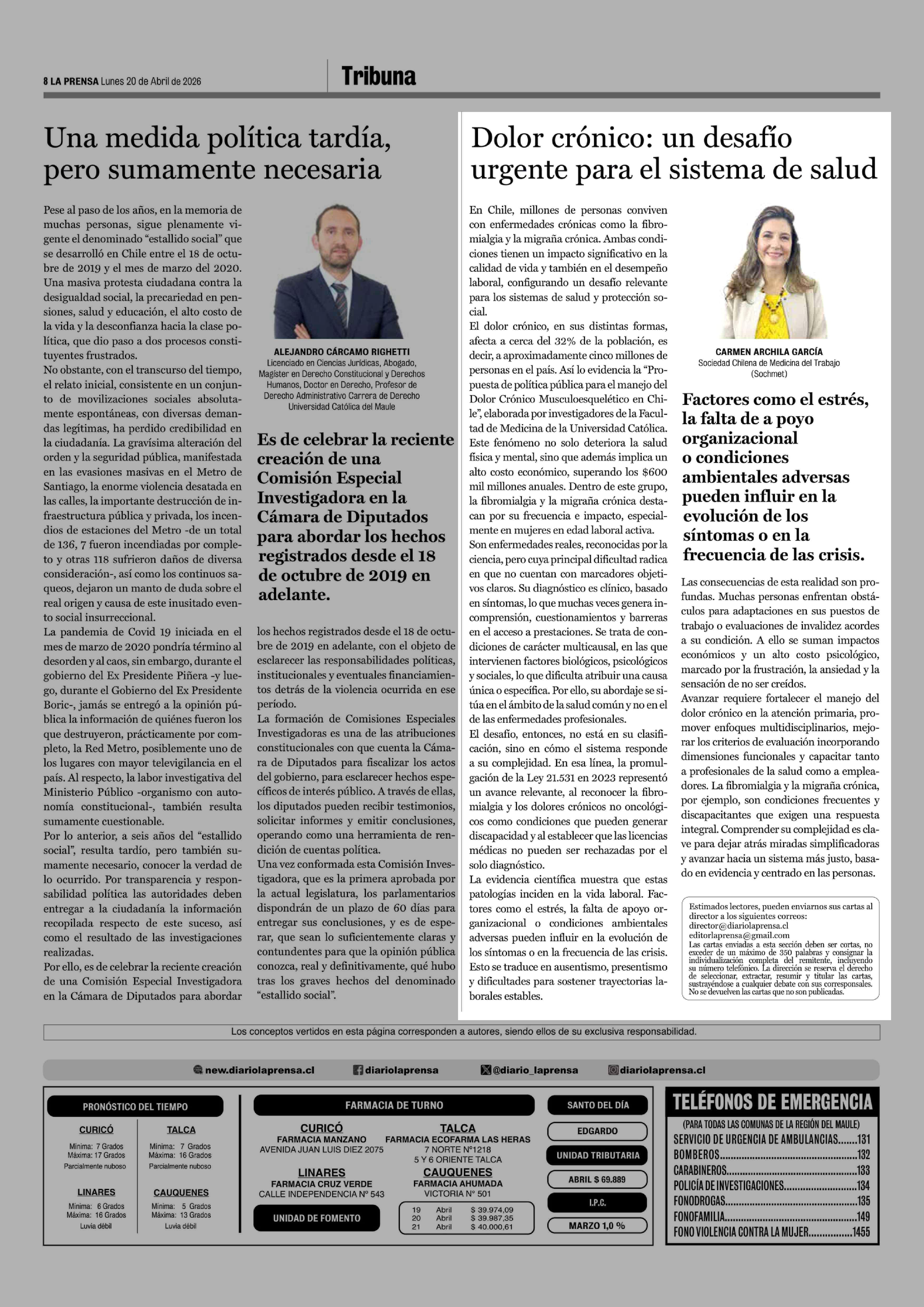 Columnas de Opinión: Dolor crónico: un desafío urgente para el sistema de salud 20-04-2026 La Prensa de Curicó |