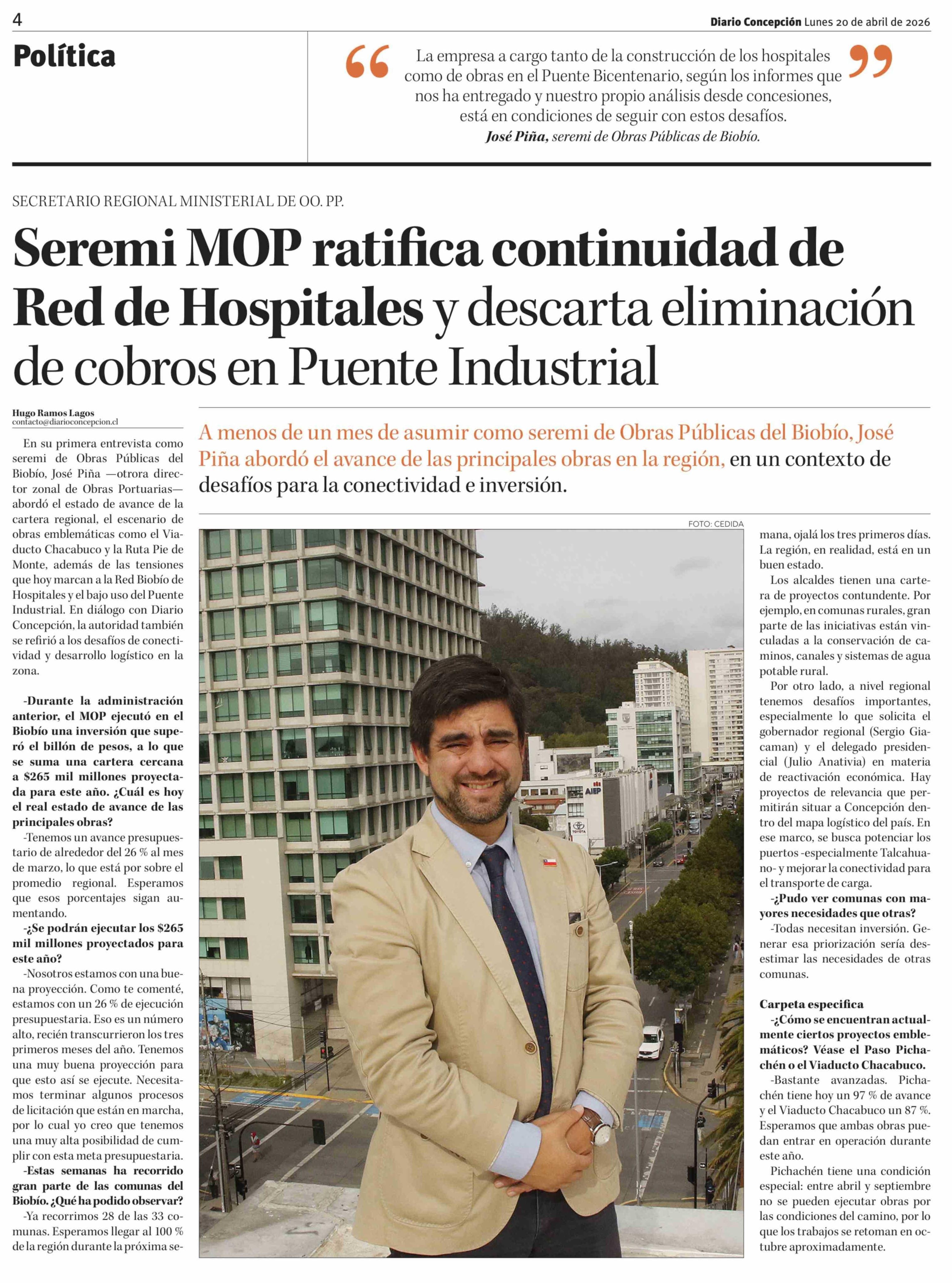 Seremi MOP ratifica continuidad de Red de Hospitales y descarta eliminación de cobros en Puente Industrial 20-04-2026 Diario Concepción |
