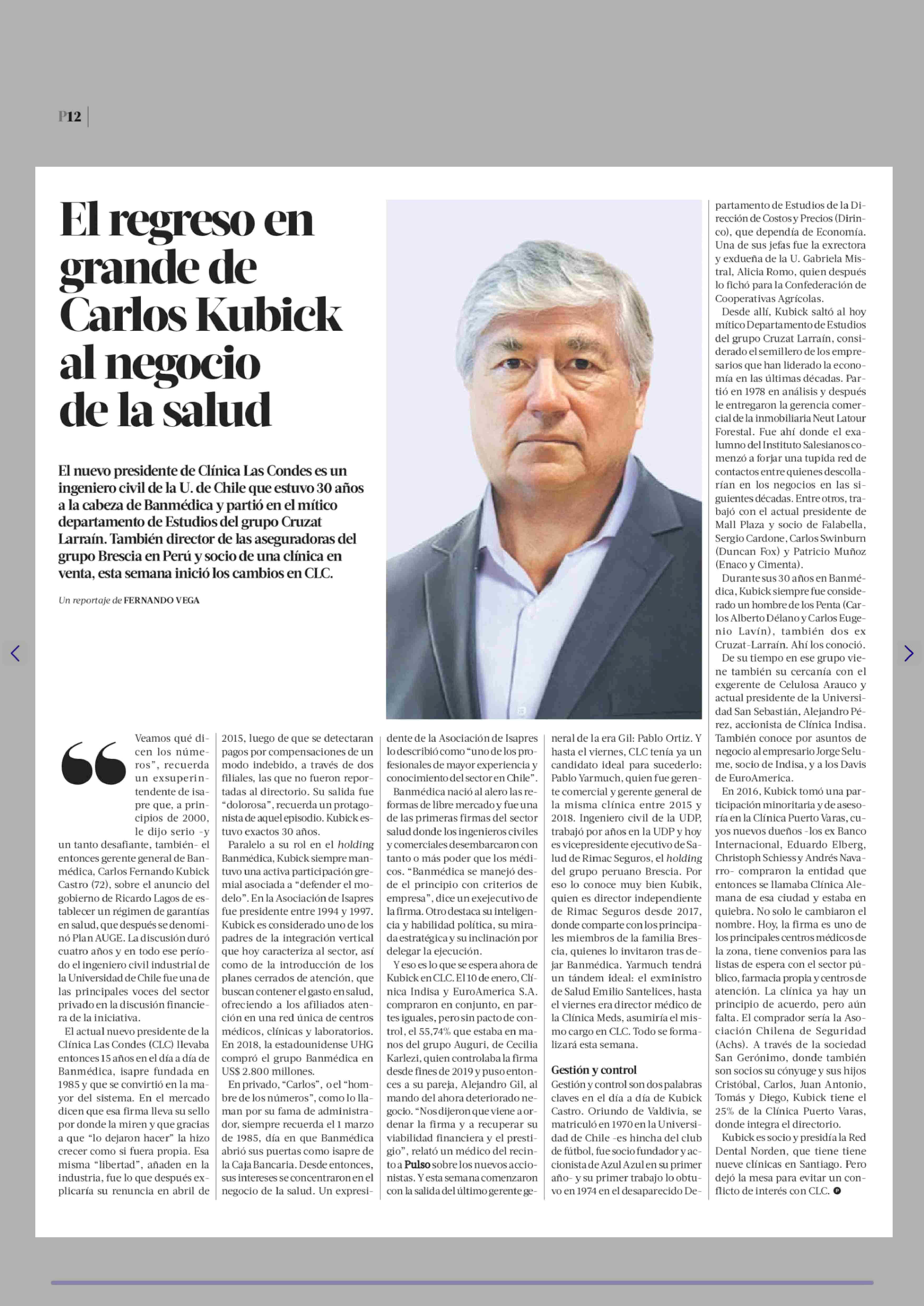 El regreso en grande de Carlos Kubick al negocio de la salud 26-01-2025 La Tercera |