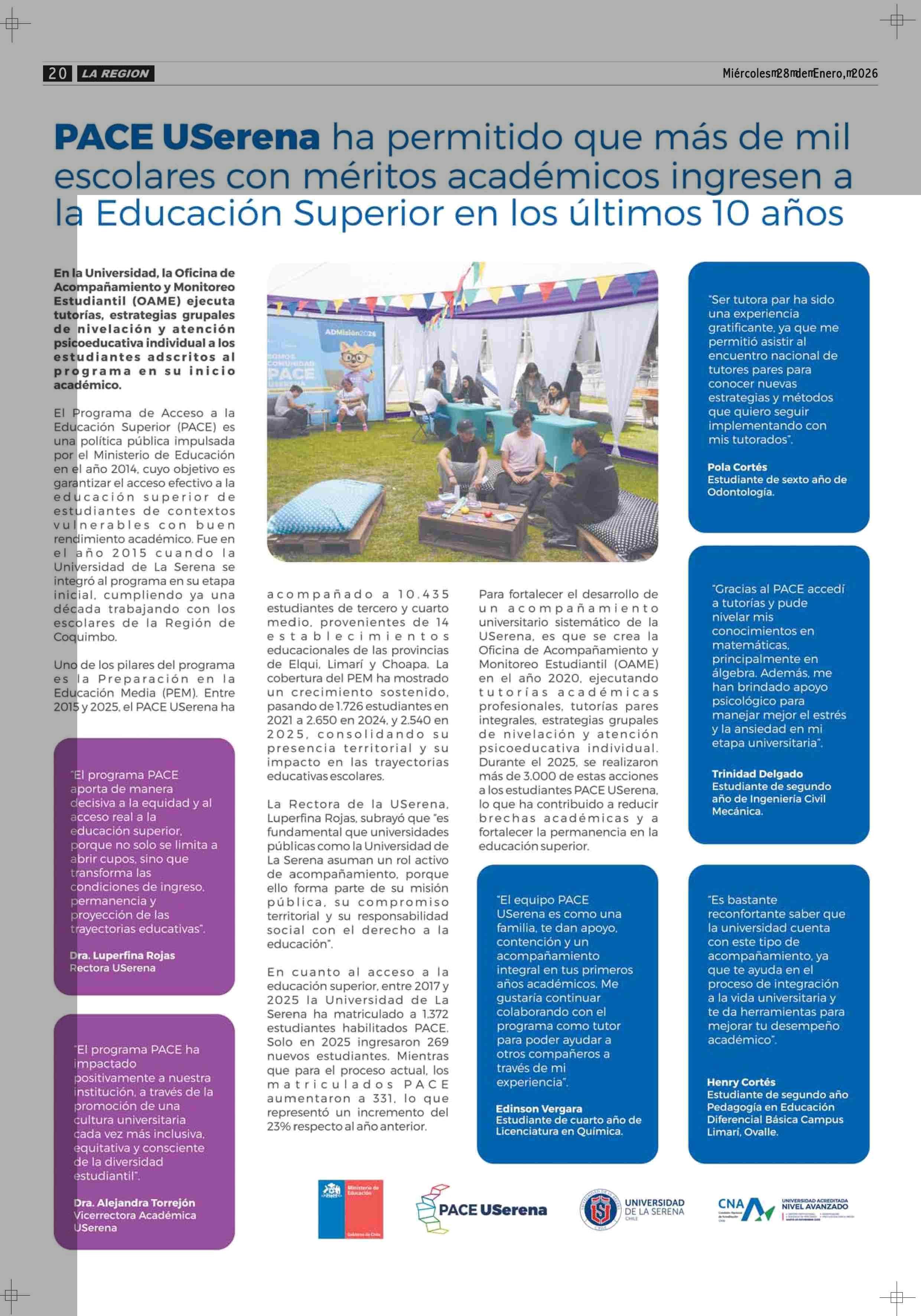 PACE USerena ha permitido que más de mil escolares con méritos académicos ingresen a la Educación Superior en los últimos 10 años 28-01-2026 Diario la Región |