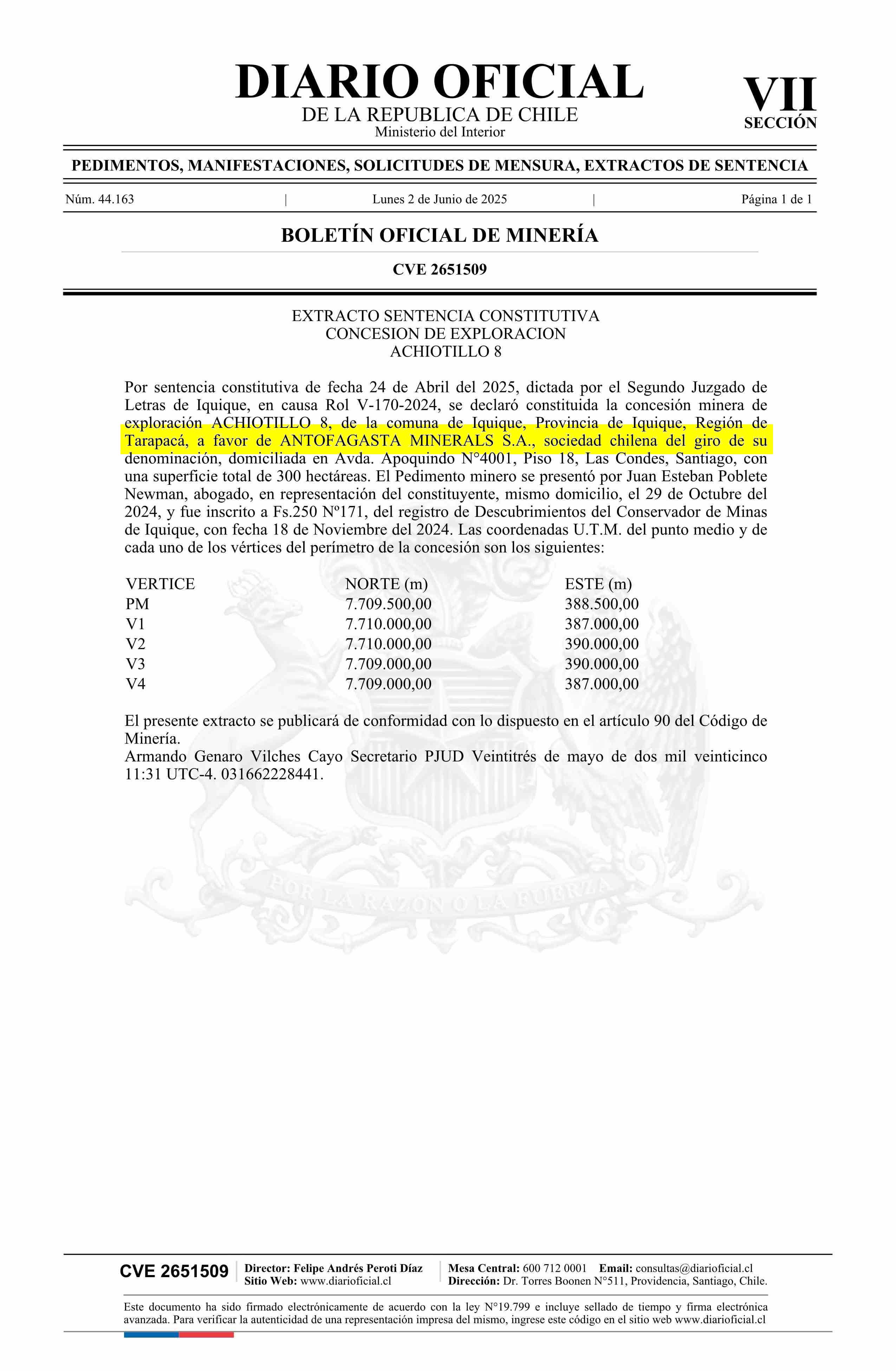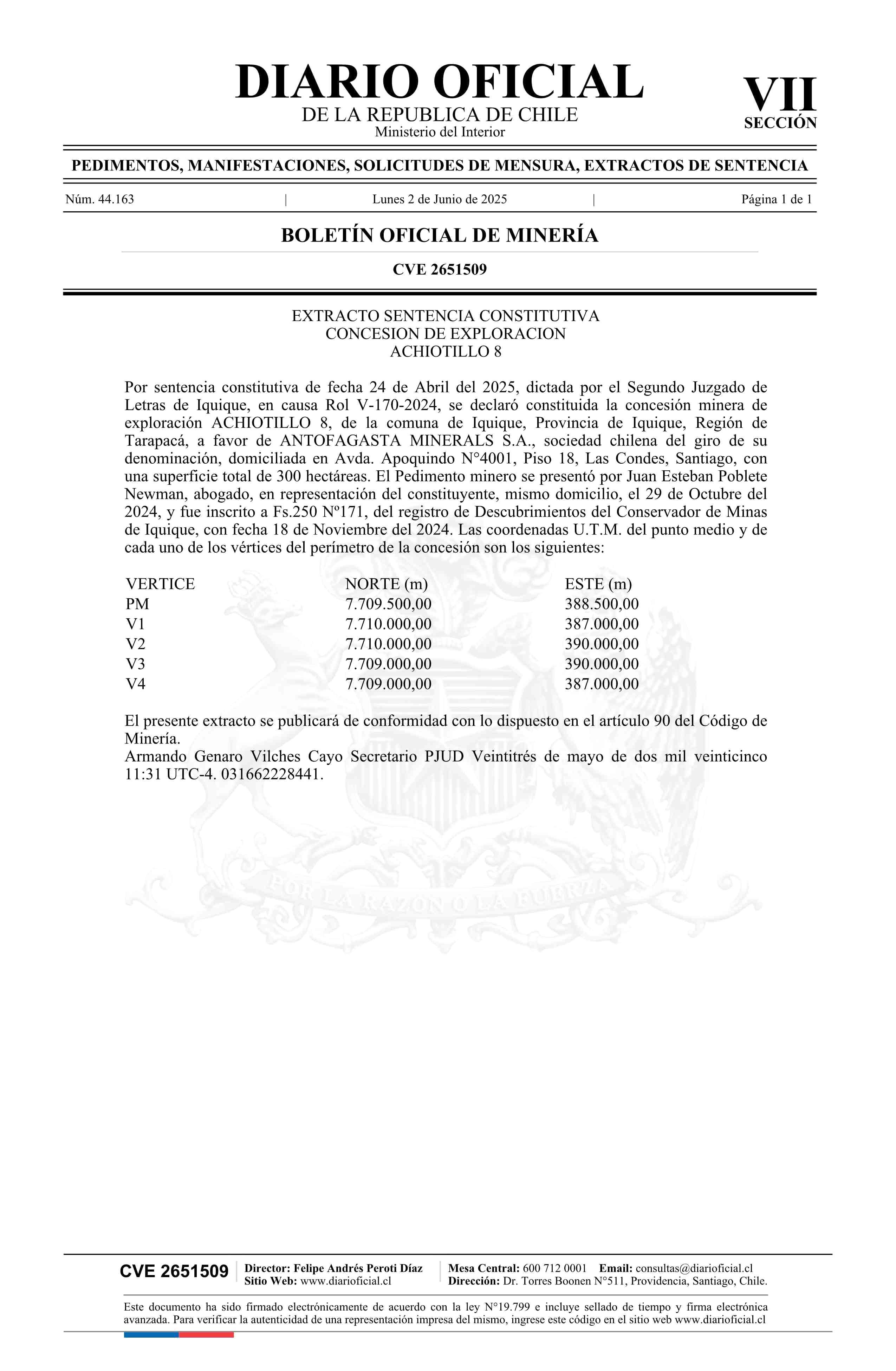 ACHIOTILLO 8 / Antofagasta Minerals S.A. 02-06-2025 DIARIO OFICIAL CHILE - BOLETÍN OFICIAL DE MINERÍA |
