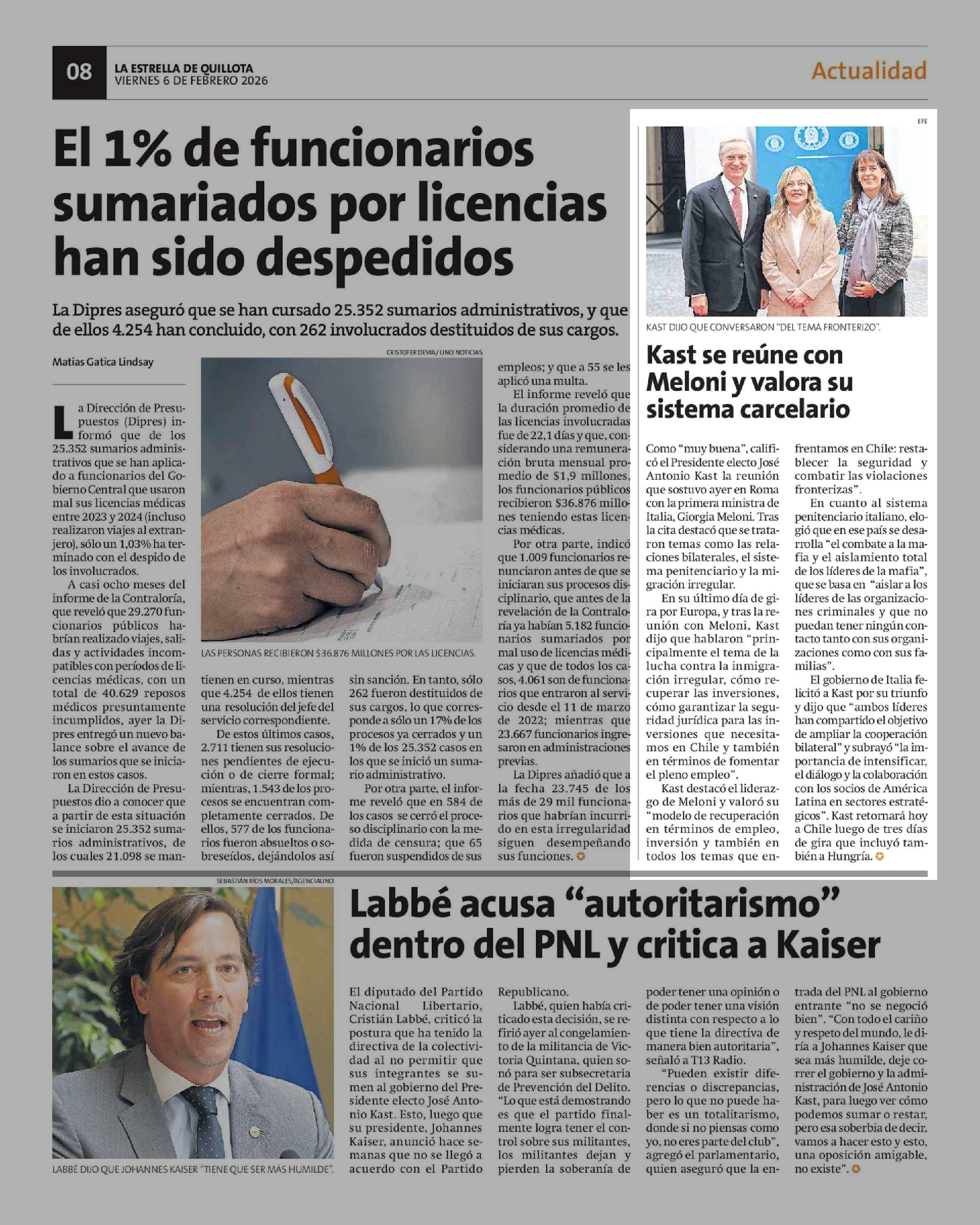 Kast se reúne con Meloni y valora su sistema carcelario 06-02-2026 La Estrella de Quillota |