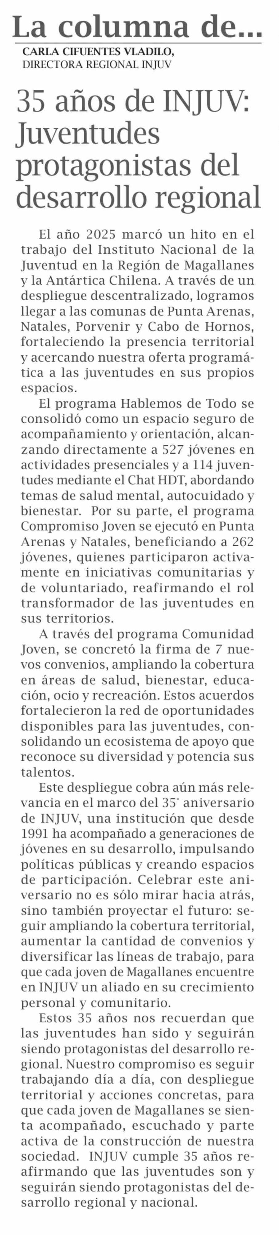Columnas de Opinión: 35 Años de INJUV: Juventudes protagonistas del desarrollo regional 14-02-2026 El Pingüino |