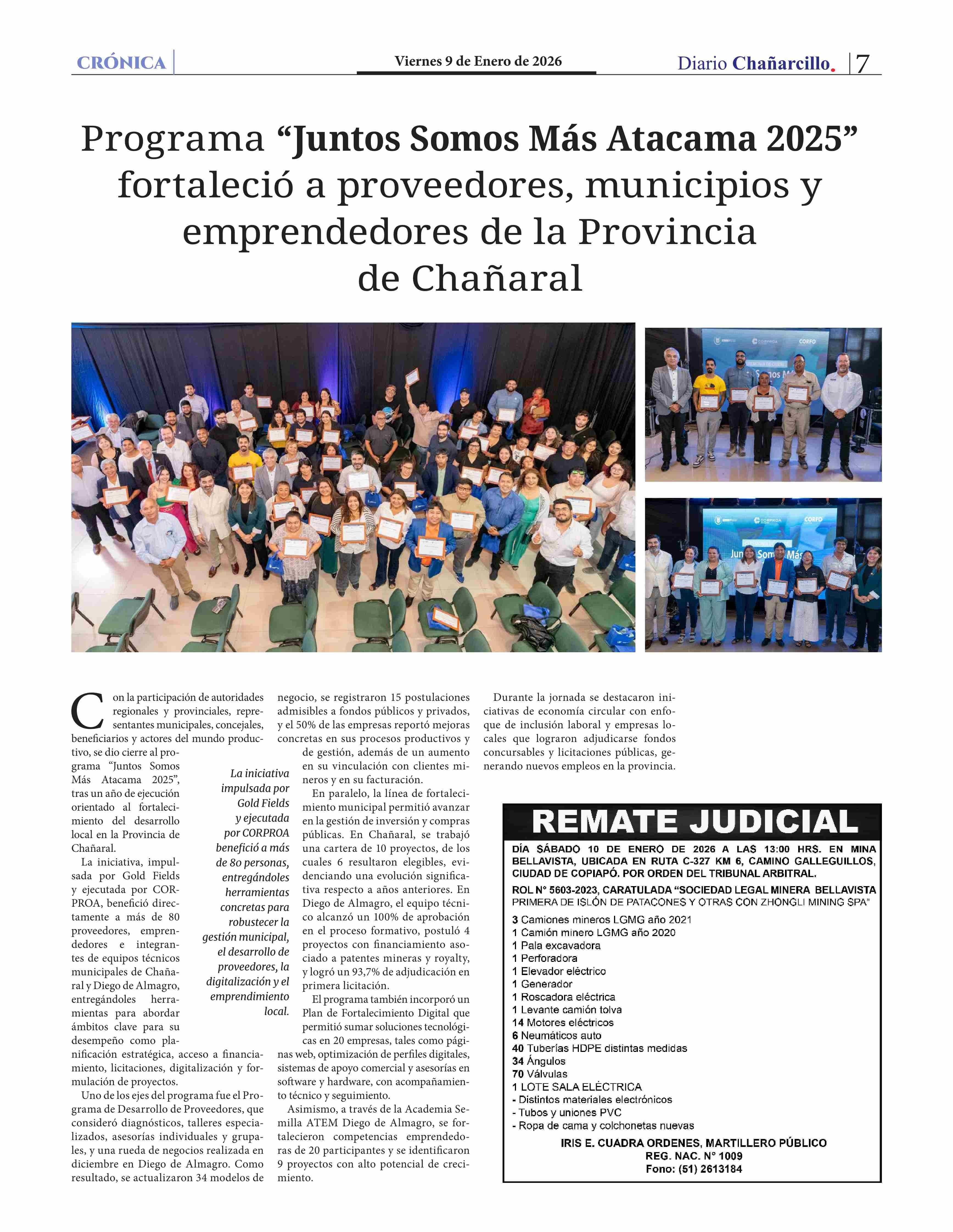 Programa "Juntos Somos Más Atacama 2025" fortaleció a proveedores, municipios y emprendedores de la Provincia de Chañaral 09-01-2026 Diario Chañarcillo |