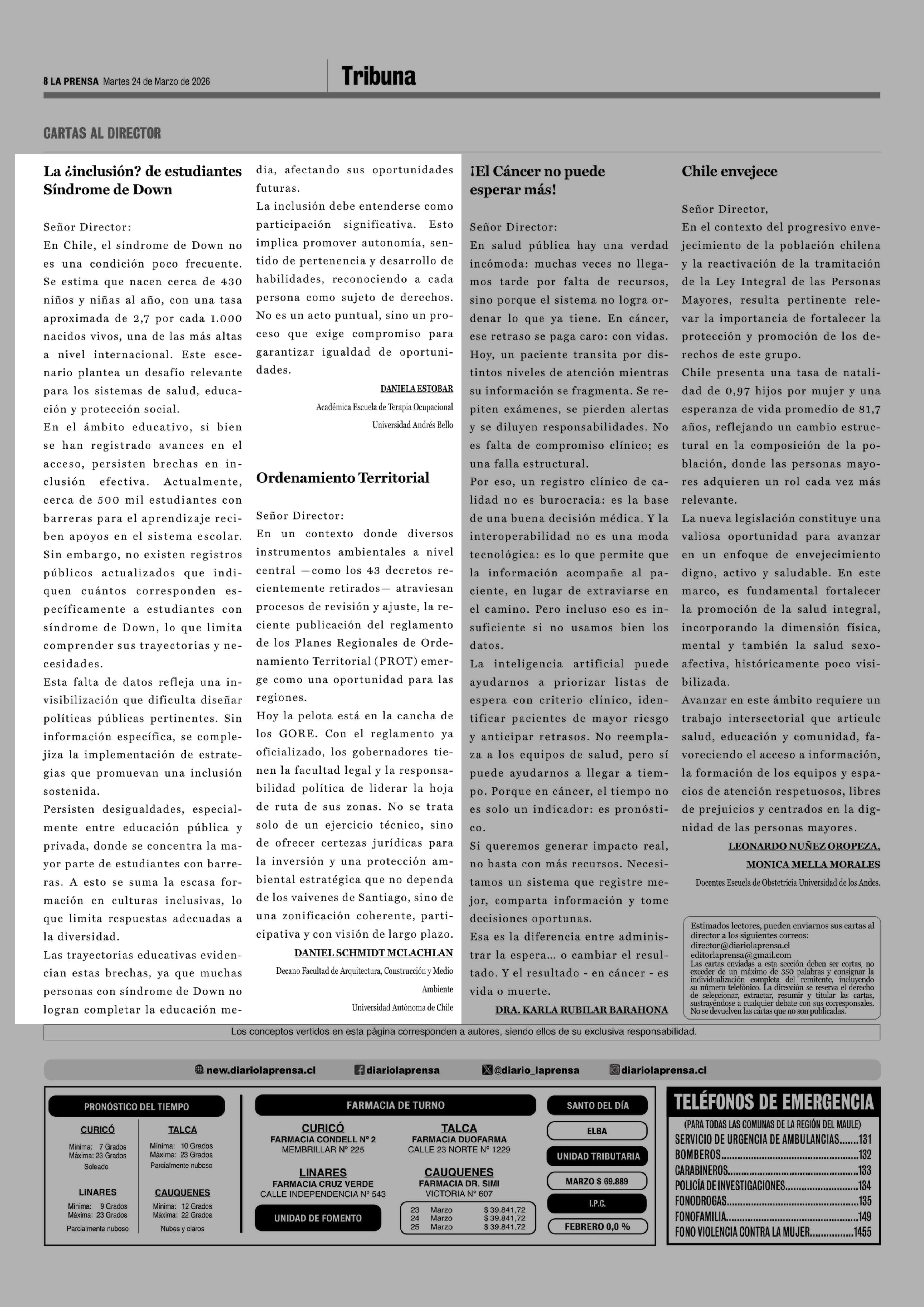 CARTAS: La ¿inclusión? de estudiantes Síndrome de Down 24-03-2026 La Prensa de Curicó |